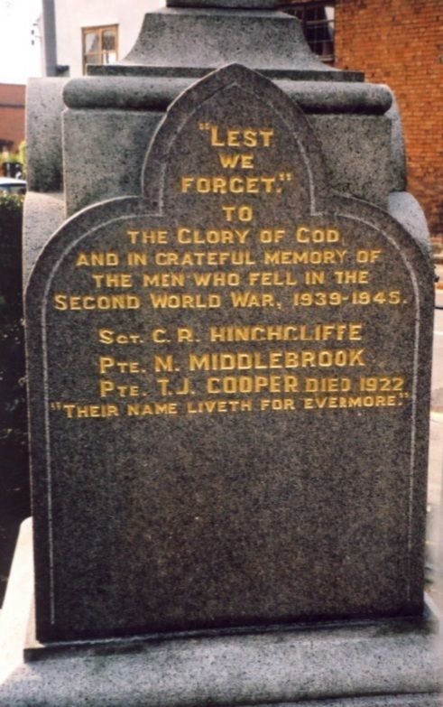 Located on the village green close to St Oswald's Church, the names of men lost during World War Two have been added, on a separate plaque, to a stone cross commemorating the locality's Great War fatalities. Korean War dead from the area are also remembered on this cross, again separately.