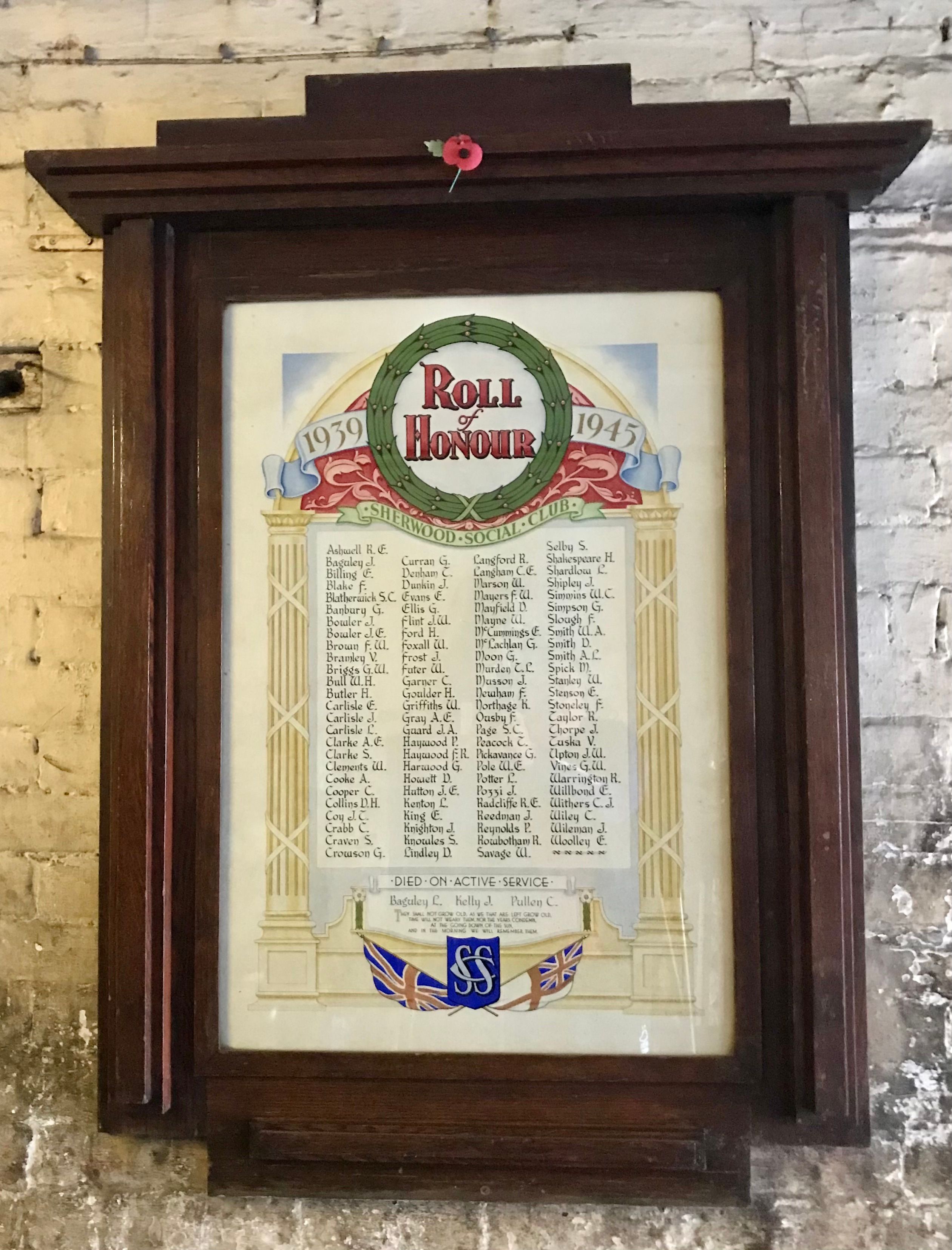 Rescued by Mr. J. T. Coy, when the Sherwood Social Club premises were sold for redevelopment, he is the Son of one of the Members who had survived World War Two, the Roll of Honour is now proudly mounted on the wall in his classic car garage on the nearby Broxtowe Street, Sherwood, Nottingham, (J. T. Coy, Broxtowe Street Garage).