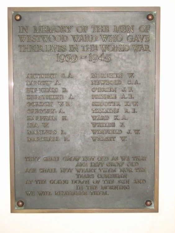 After the Second World War, another memorial plaque was added to Westwood St Mary's Great War memorial. It was donated by the British Legion and unveiled on 16 November 1952 by the Duke of Portland. It is a dark coloured metal plaque 22 inches by 16 inches (56cm x 41cm), mounted on the wall opposite the main entrance to the church. Below it is a glass-topped case holding a book produced by a local history group, containing their research into the lives and families of every soldier named on the village War memorial. (Courtesy of the Southwell & Nottingham Church History Project).
