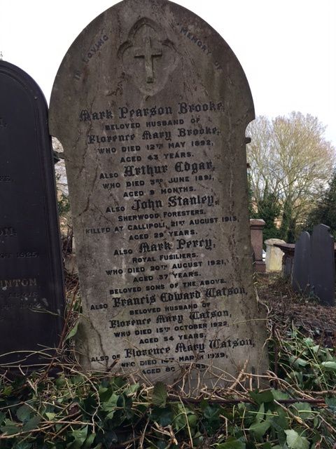 Nottingham General Cemetery. Family grave, inscription: ‘Mark Pearson Brooke, beloved husband of Florence Mary Brooke, who died 12th May 1902, aged 43 years. Also Arthur Edgar, who died 3rd June 1891, aged 9 months. Also John Stanley, Sherwood Foresters, killed at Gallipoli, 21st August 1915, aged 29 years. Also Mark Percy, Royal Fusiliers, who died 20th August 1921, aged 37 years. Beloved sons of the above. Francis Edward Watson, beloved husband of Florence Mary Watson, who died 15th October 1922, aged 54 years. Also of Florence Mary Watson who died 14th March 1939 aged 80 years.;