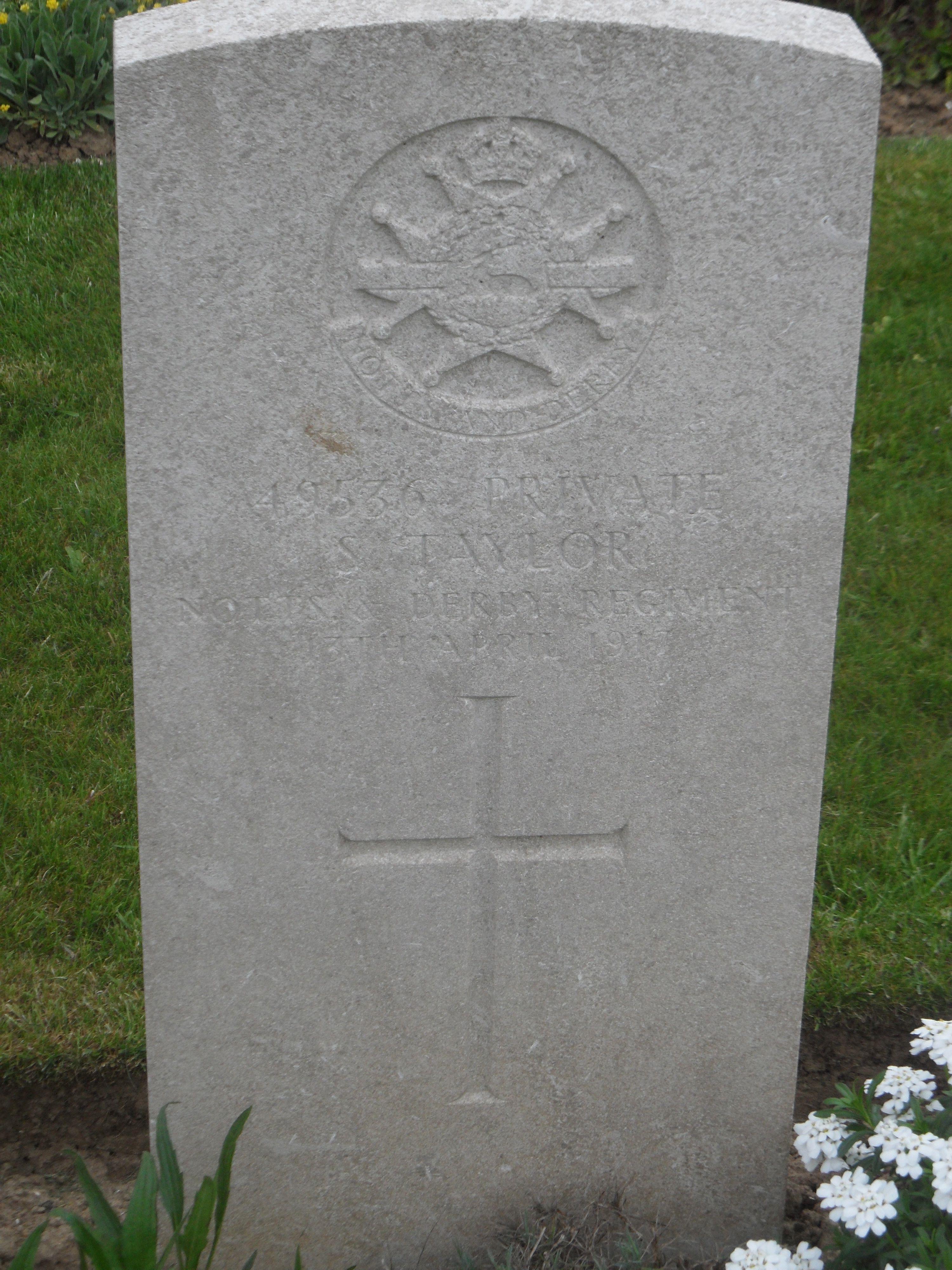 Private Samuel Taylor enlisted at Derby whilst residing at Nottingham, he served with the 1st battalion Sherwood Foresters Regiment, he died of wounds on 13th April 1917 and is buried at Peronne Road Cemetery, Maricourt