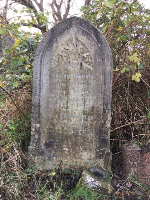 Nottingham General Cemetery. Family grave and headstone, inscription: ‘In loving memory of Maria the beloved wife of William Henry Harrison, who died Jany. 22nd 1914 aged 63 years. Also of William beloved husband of the above who died June 1st 1943 in his 95th year. Re-united. Also William Henry 2/8 Sherwood Foresters son of the above, who was killed in action in France Decr. 12th 1917 aged 30 years. ‘He lies not in his native land but under foreign skies far from those who loved him best In a hero’s grave he lies.' Also of Arthur son of the above who died Octr. 3rd 1887 aged 13 months … (-) Mary ...'