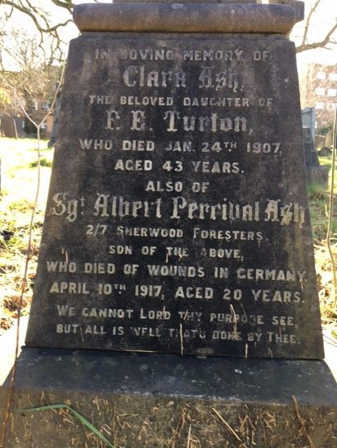 Nottingham General Cemetery. Turton family grave, inscription: Face 1. In ever loving memory of Frances Elizabeth Turton, who died June 27th, 1822, in her 93rd year. ‘At Rest.’ Also of Evelyn Thomas who died Feb. 3rd, 1910, aged 38 years. And of Edson Buller, sons of the above, who died April 12th 1914, aged 41 years. ‘They will be done.’ ‘In loving memory of Clara Ash, the beloved daughter of FE Turton, who died Jan. 24th 1907 aged 43 years. Also of Sgt. Albert Percival Ash 2/7 Sherwood Foresters son of the above, who died of wounds in Germany, April 10th. 1917, aged 20 years. ‘We cannot Lord thy purpose see, But all is well that is done by thee’ Face 3. In loving memory of Annie E Davies daughter of Frances E Turton died Dec. 26th ? 1933 aged 77 years. ‘At Rest.’