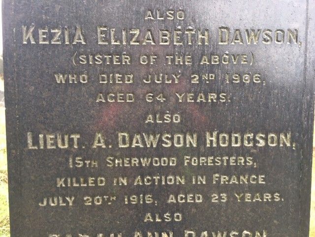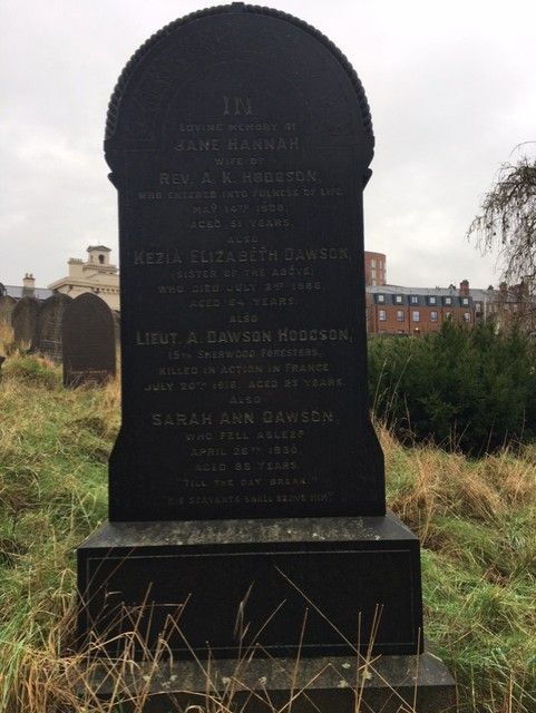Nottingham General Cemetery: commemorated on family grave/headstone, ‘In loving memory of Jane Hannah, wife of Rev. AK Hodgson, who entered into fulness of life May 14th, 1900, aged 51 years. Also Kezia Elizabeth Dawson, (sister of the above), who died July 2nd 1906, aged 64 years. Also Lieut. A Dawson Hodgson, 15th Sherwood Foresters, killed in action in France July 20th 1916, aged 23 years. Also Sarah Ann Dawson, who fell asleep April 26th 1930 aged 95 years. ‘Till the day breaks.’ ‘His servants shall serve him.’'