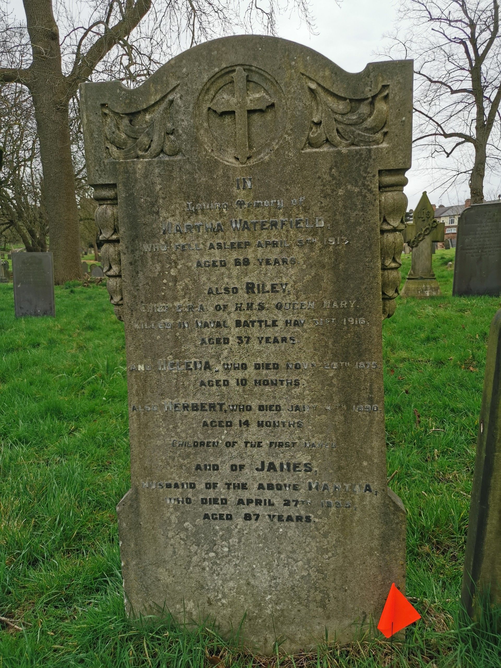 Nottingham General Cemetery, family grave, headstone inscription: 'In loving memory of Martha Waterfield who fell asleep April (-) 1913 aged 68 years. Also Riley (-) of HMS Queen Mary, killed in Naval Battle May 31st 1916, aged 37 years. Helena who died (-) 1875 aged 10 months. Herbert who died (-) 1890 aged 14 months. Children of the above. And of James husband of the above Martha who died April 27th 1933 aged 87 years.'
