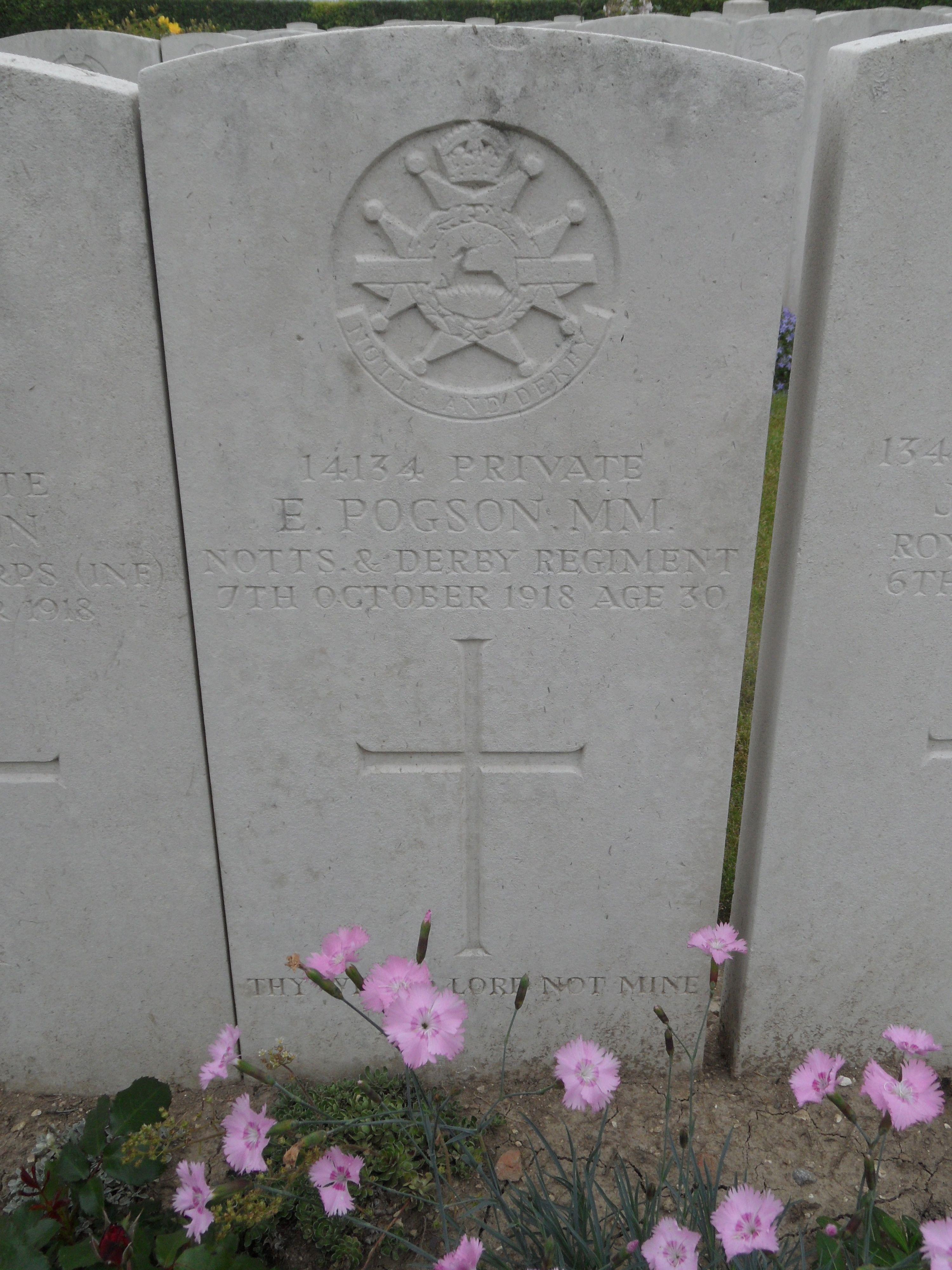 CWG additional information:- Son of James and Charlotte Pogson, of South Lodge, Welbeck and is buried in Tincourt new British Cemetery, France.