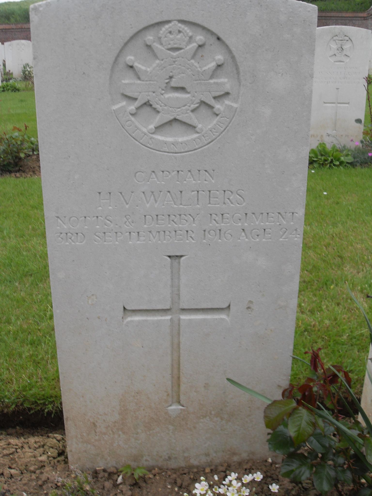 Captain Harold Victor Walters was a member of the Nottingham Officer Training Corps, he was gazetted to Second Lieutenant on 30th June 1915 to the 17th battalion Sherwood Foresters, he was promoted to Lieutenant on 16th October 1915 and to Captain on 1st January 1916, he served n France from 6th March 1916. He was killed in action at Beaumont Hamel on 3rd September 1916 and is buried at Ancre British Cemetery, Beaumont-Hamel, Somme, France.