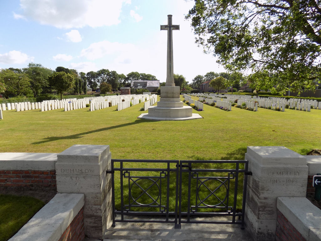 CWGC History of Dunhallow A.D.S. Cemetery (extract): 'Duhallow Advanced Dressing Station, believed to have been named after a southern Irish hunt, was a medical post 1.6 kilometres north of Ypres (now Ieper). The Cemetery was begun in July 1917, on the day of the Battle of Pilckem Ridge, and Plots I and IV were completed by November 1918 ... After the Armistice, 633 bodies (of which 228 were not identified) were brought into this Cemetery from isolated graves and small Cemeteries on the battlefields North, East, and South of Ypres (listed) ...' (www.cwgc.org)