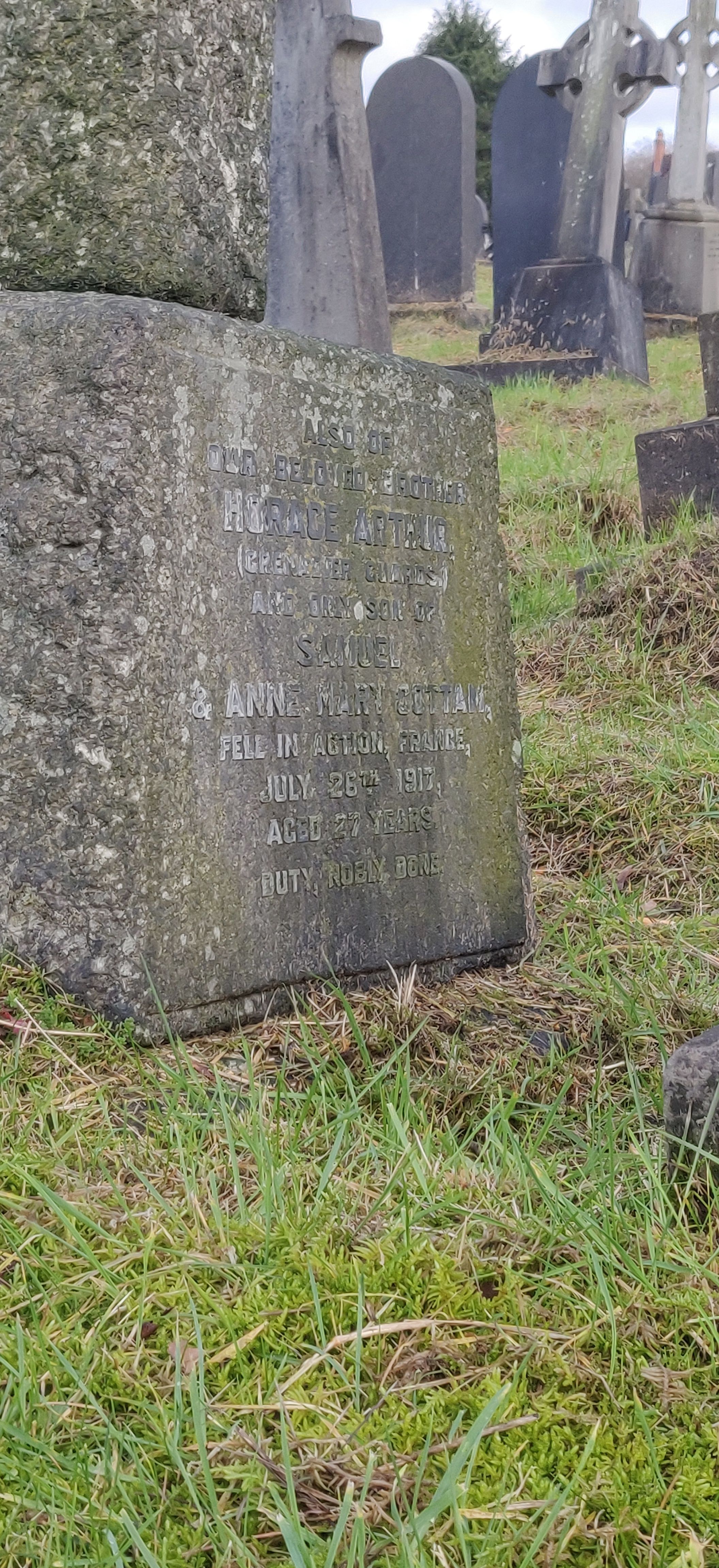 Nottingham Church (Rock) Cemetery. Family grave and headstone, inscription: ‘And of our beloved brother, Horace Arthur (Grenadier Guards), and only son of Samuel and Anne Mary Cottam, fell in action, France, July, 26th, 1917, aged 21 years. Duty nobly done.’