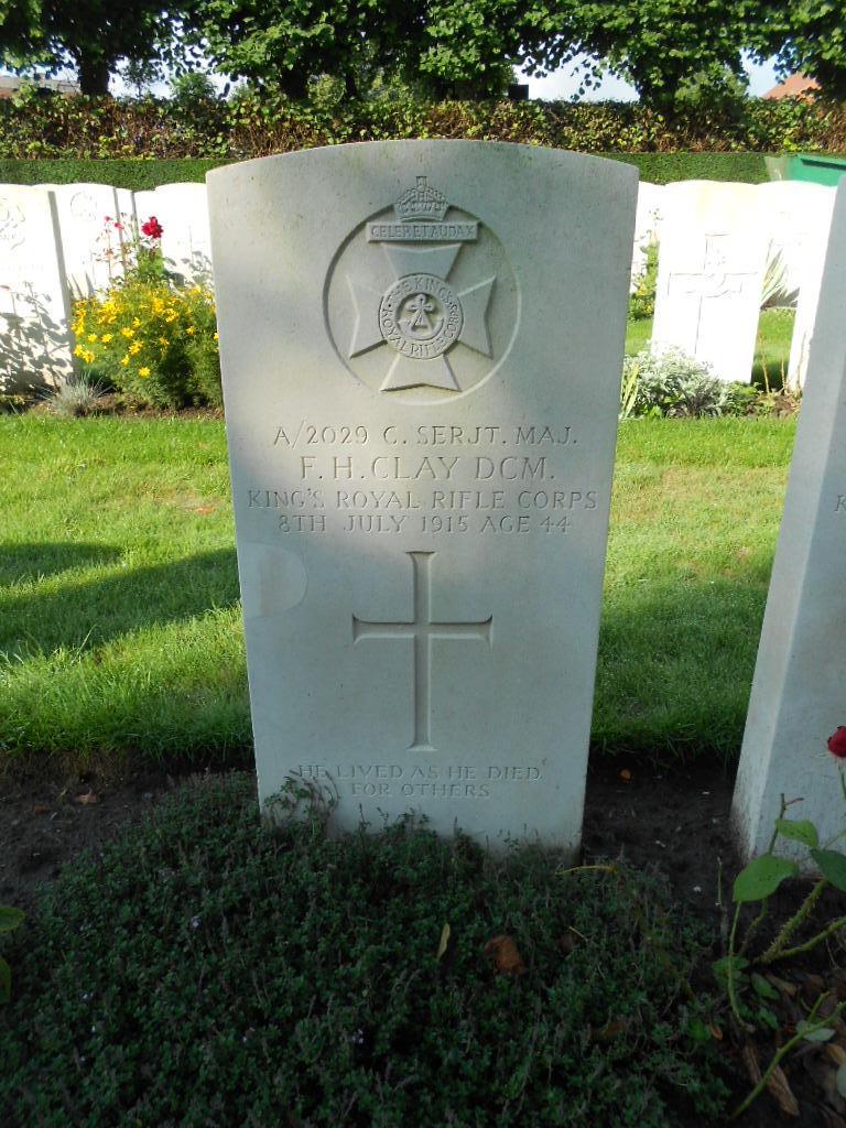 “CLAY. – To the dear memory of a brave and gallant rifleman, Co.-Sergt.-Major F. Clay, D.C.M., late of 3rd and 7th K.R.R., killed in action, Ypres, July 8th, 1915; service, 25 years; aged 45 (pensioner). – Wife and son.”