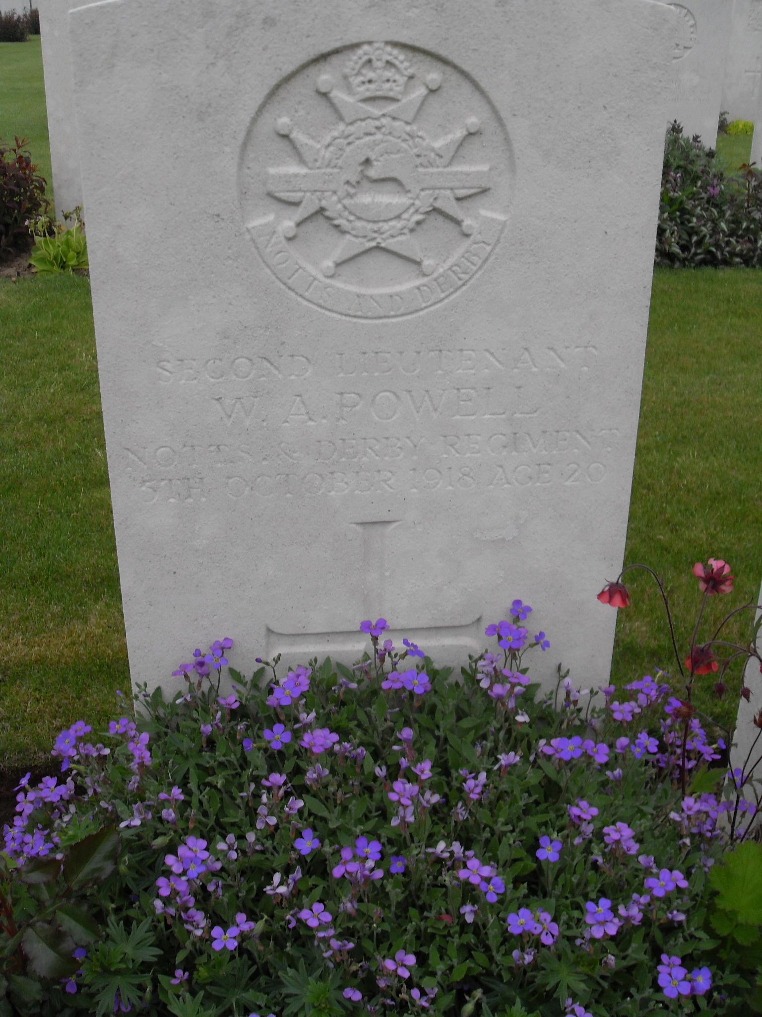Family grave, Nottingham Southern Cemetery. (William Arthur and Mary Elizabeth Powell) 'Also to the perpetual memory of their dearly loved son, William Arthur Powell, 2nd Lieutenant 11th Bn Sherwood Foresters, killed in action in France, October 5th 1918, aged 20 years.' Probate 11 March 1919. Powell William Arthur (the younger) of 34 Priory-road West Bridgford, Nottinghamshire, second lieutenant in HM Army died 5 October 1918 in France. Administration Nottingham 11 March to William Arthur Powell traveller. Effects £191 15s 11d.His brother, Second Lieutenant James Frederick Powell, 7th attached 15th Battalion Nottinghamshire & Derbyshire Regiment, was wounded and taken prisoner on 20th October 1918.Article published 7th November 1918 in the Nottingham Evening Post :- “WOUNDED AND PRISONER OF WAR. “SEC.-LIEUT. J. F. POWELL, Sherwood Foresters, reported wounded and missing on October 20th, is the younger twin son of Mr. and Mrs. Powell, Priory-road, West Bridgford. He proceeded on active service in November of last year, and since the official telegram arrived the parents have received a postcard from a repatriated prisoner declaring that the young officer is a prisoner of war in Germany, and that he saw him on a stretcher. Both he and his brother, who has made the supreme sacrifice, were educated at the Mundella School.” Above article and information is courtesy of Jim Grundy and his facebook pages Small Town Great War Hucknall 1914-1918