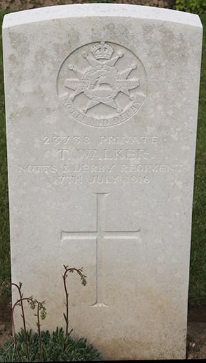 Private Thomas Walker enlisted at Nottingham he served with the 15th battalion Sherwood Forester Regiment, he was Killed in action, 17th July 1916, whilst in the line South-East of Trones Wood, West of Maltz Horn Farm, France, being heavily bombarded by German tear gas and gas shells during the Battle of the Somme.