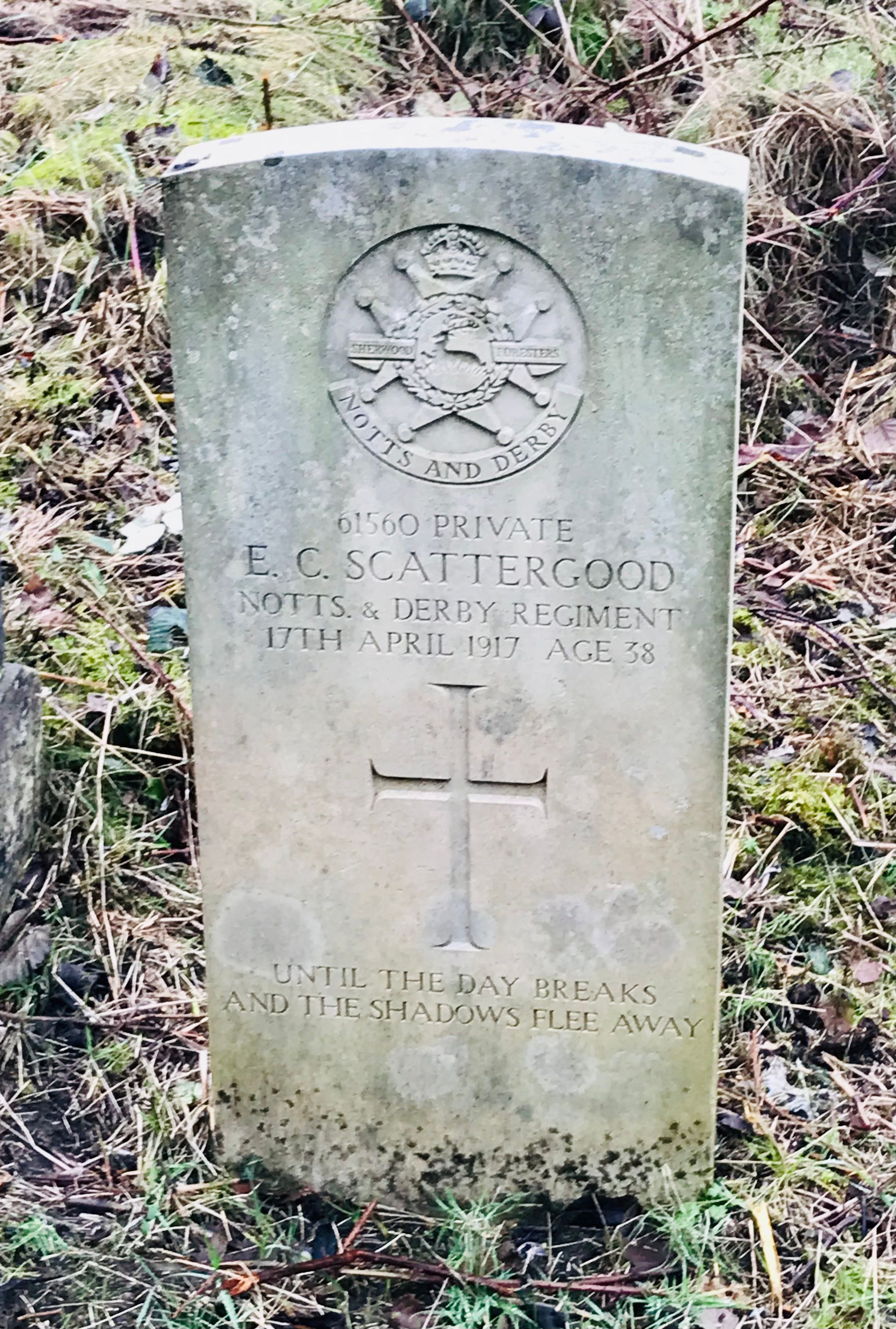 Ernest Charles Scattergood enlisted at Nottingham and served with the 9th Battalion Sherwood Foresters (Notts & Derby Regiment).