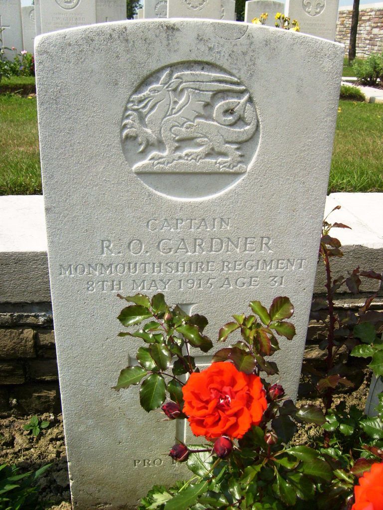 “Robert Oswald Gardner to Second Lieutenant 1st May 1908” London Gazette 21 Aug 1908The French and Belgian channel ports were an important German military objective and the Belgian town of Ypres became the key to achieving this. Over the next four years four separate battles would be needed to secure its posi-tion for the allies. On the 10th August 1914 the 3rd Battalion of the Monmouthshires moved to camp at Oswestry, perhaps it was here that Capt. Gardner joined them. After training at Northampton they landed in France on the 14th February 1915 and by 3rd March they were assigned to the 83rd Brigade of the 28th Division, one of the two British Divisions and one Canadian Division holding the front line around Ypres. On 22nd April three miles away, gas was used by the Germans against French Colonial troops at Langemark. It was the first time this terrible weapon hade been deployed, and both sides were unprepared for the devastation it caused. Luckily the Germans failed to capitalise on an open route to Ypres. More gas attacks followed, this time against the Canadians. At this time there was no personal protection against the yellowy green clouds of chlorine that could be seen and sniffed daily. The 3rd Monmouths were made ready to move up in support as a constant stream of wounded and coughing Canadian soldiers passed through the lines. May 8th-13th 1915 The Battle of Frezenberg (2nd Battle of Ypres)By the 7th May the Germans were only 2 miles from Ypres and on the 8th May Capt Gardner's B company joined the front line at Frezenberg, east of the town. This coincided with a ferocious assault by the Germans and during this Capt. Gardner was killed. The regimental history records that :- 'Both battalions were virtually annihilated... but they had put up a splendid fight and B Company of the 3rd Battalion earned special distinction by holding on in the front line...although quite isolated, the troops on both flanks having been driven back. Its stand has been picked out by the Official History of the War as 'among the historic episodes of the War'. Captain Gardner is buried at Oostaverne Wood Cemetery about 3 miles south of Ypres. Captain Gardner's wife Amy subsequently moved with their three children to The Vadoc on Gresford Road in Llay. In Memoriam - Robert Oswald GardnerA plaque in St.George's Memorial Chapel in Ypres commemorates the 13 officers and 335 other ranks of the Monmouthshires who fell in the second battle of Ypres. On the Frezenberg Ridge, east of Ypres there is a limestone memorial to the 1st Monmouthshire Regiment commemorating the officers and men who were killed on the 8th May.