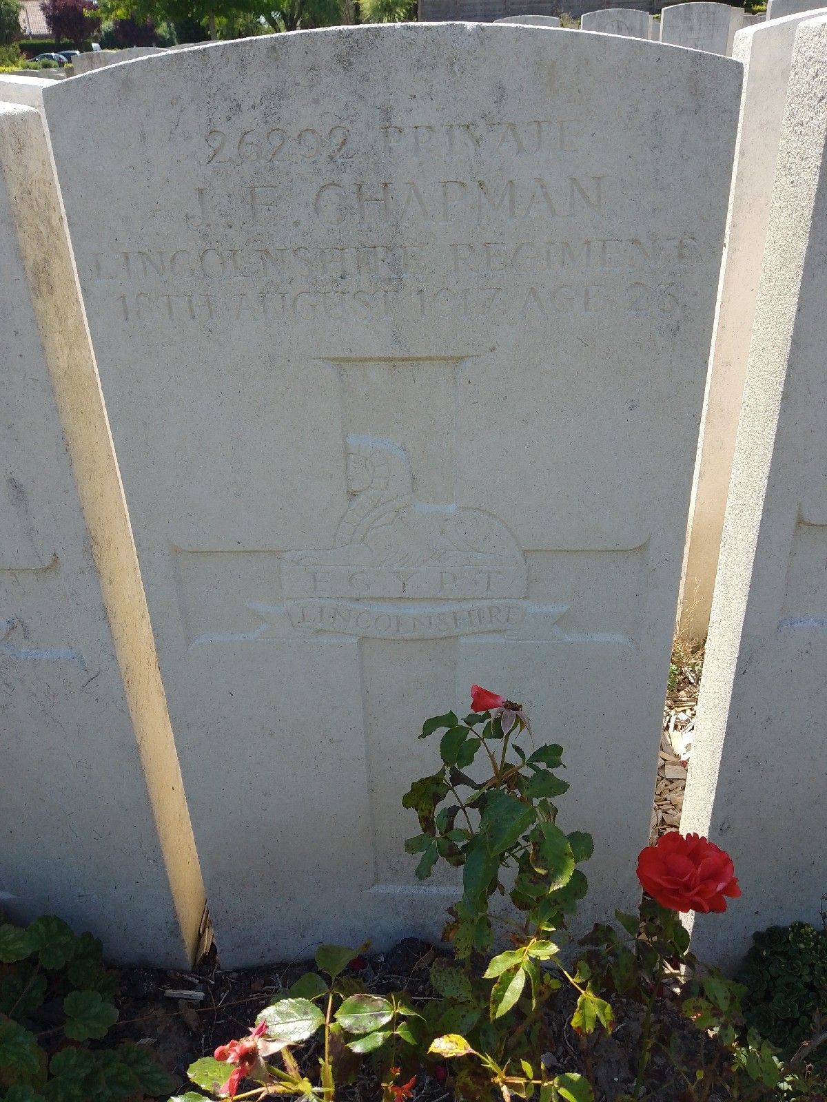 Private James Frederick Chapman enlisted a Nottingham, he initially served with the service number 46292 in the 9th battalion Lincolnshire Regiment, he transferred to (28312) 48th Coy Labour Corps and was killed in action on 18th August 1917, he is buried at Outtersteene Communal cemetery extension, Bailleul, France