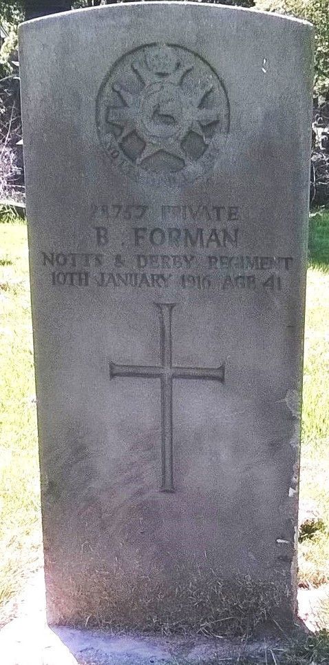 Private Benjamin Forman enlisted at Worksop, he served with the 3rd battalion Sherwood Foresters Regiment, he died on 10th January 1916, he is buried at South Shields (Harton) Cemetery