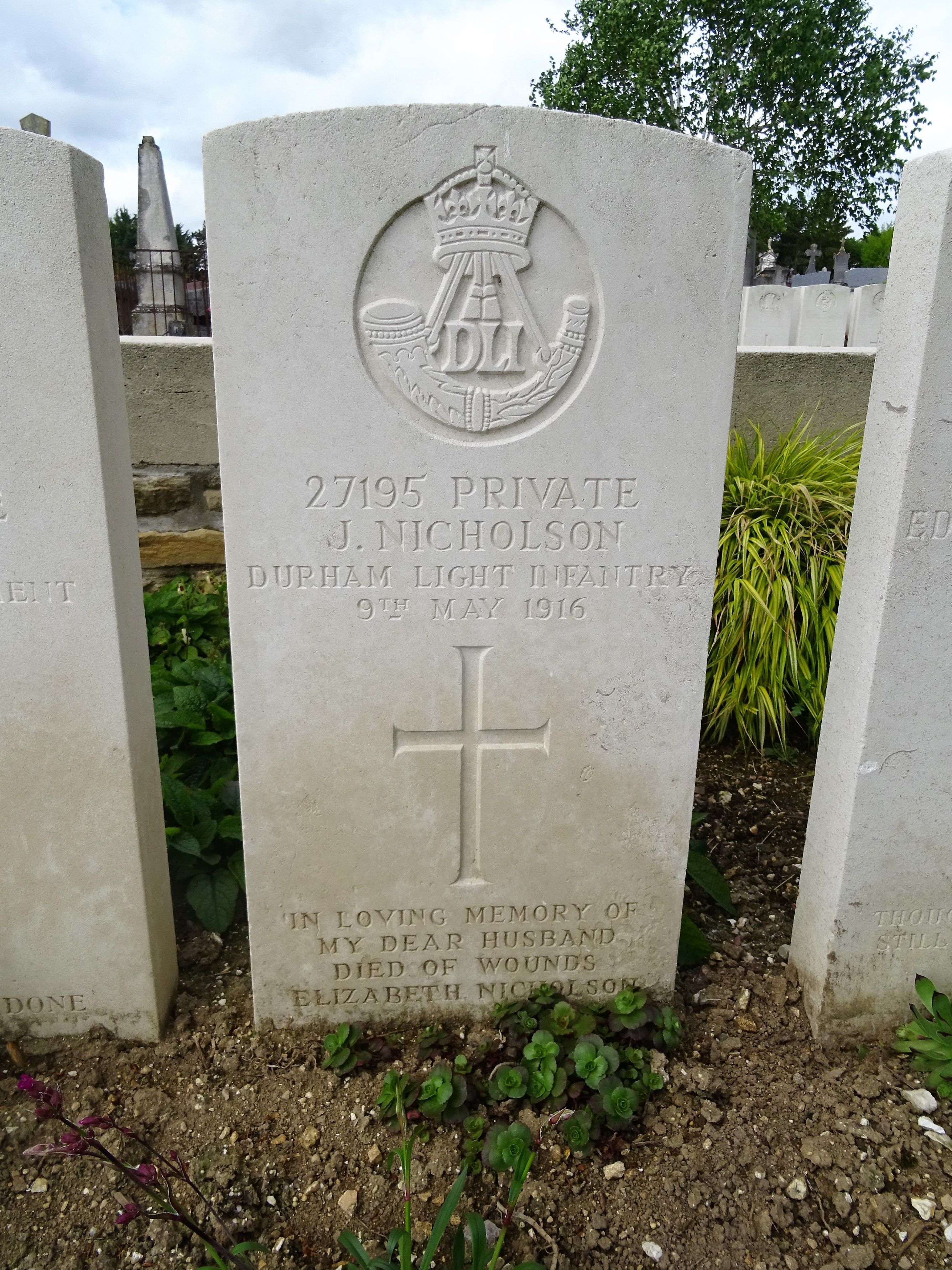 Private John Nicholson enlisted at Sunderland, he served with the 15th battalion Durham Light Infantry, he died of wounds on 9th May 1916 at the 5th casualty clearing station he is buried at Corbie Communal Cemetery Extension