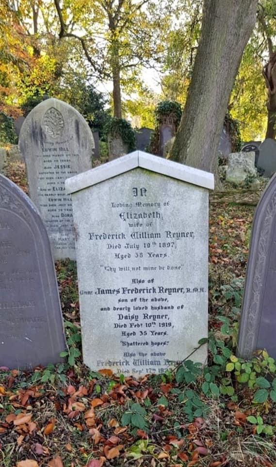 Nottm General Cemetery grave/headstone inscription: 'n loving memory of Elizabeth, wife of Frederick William Reyner, died July 19th 1897, aged 38 years. ‘Thy Will, not mine be done’. Also of Gunr. James Frederick Reyner RMA, son of the above, and dearly loved husband of Daisy Reyner, died Feb. 10th 1919, aged 35 years ‘Shattered hopes’. Also the above Frederick William Reyner, died Sept. 17th 1923 aged 65 years.’