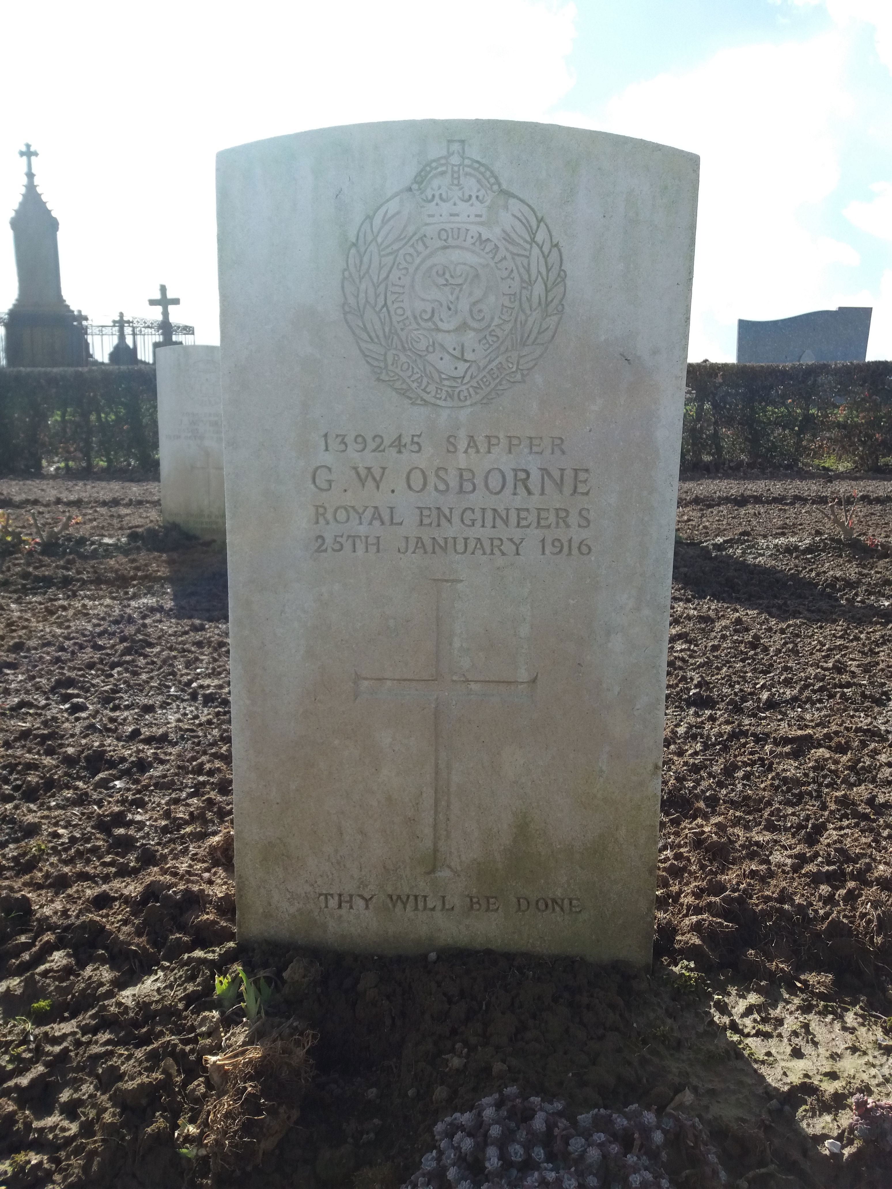 Sapper George William Osborne enlisted at Nottingham whilst residing at Grimsby, he initially served with the service number 7221 in the Scottish Rifles he later transferred to the 252nd Tunnelling Company Royal Engineers. He died of wounds on25th January 1916 and is buried at Mailly-Maillet Communal Cemetery Extension