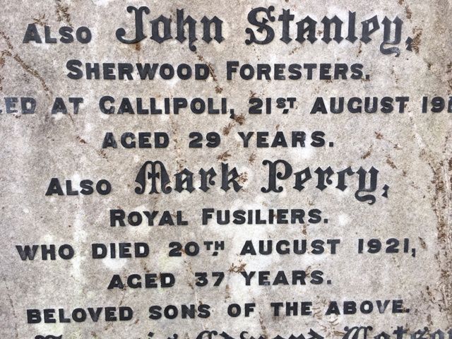 Nottingham General Cemetery. Family grave, inscription: ‘Mark Pearson Brooke, beloved husband of Florence Mary Brooke, who died 12th May 1902, aged 43 years. Also Arthur Edgar, who died 3rd June 1891, aged 9 months. Also John Stanley, Sherwood Foresters, killed at Gallipoli, 21st August 1915, aged 29 years. Also Mark Percy, Royal Fusiliers, who died 20th August 1921, aged 37 years. Beloved sons of the above. Francis Edward Watson, beloved husband of Florence Mary Watson, who died 15th October 1922, aged 54 years. Also of Florence Mary Watson who died 14th March 1939 aged 80 years.;