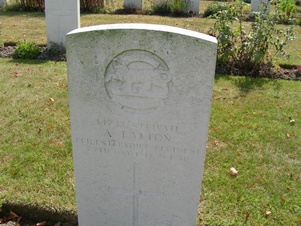 Private Arthur Tatton enlisted at Nottingham, he served with the 1 st battalion Leicestershire Regiment, he was killed in action on 27th May 1918, he is buried at Belgian Battery Corner, Belgium.