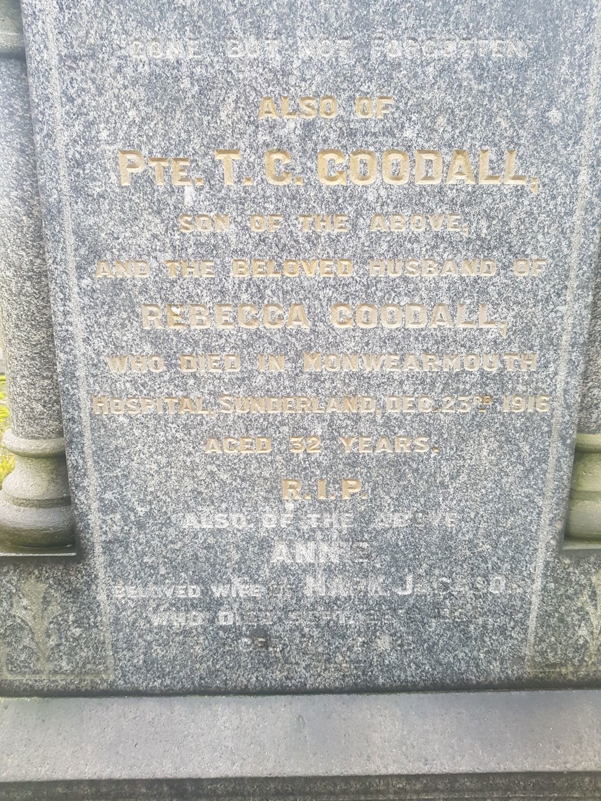 Private Tom Connelly Goodall enlisted at Mansfield, he served wit the 3rd battalin Sherwood Foresters Regiment, He died on 23rd December 1916 and is buried in Kingsway Old Cemetery, Nottinghamshire (cemetery/memorial reference: A. A.V. 2680).