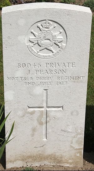 Private John Pearson enlisted on 29th March 1915 at Leicester he was living at 54 Frank Street,Leicester he was 22 yrs and 237 days old, he was a labourer his next of kin was his wife Elsie of the same address he was posted to the Leicestershire Regiment, he landed in France on 25th August 1915, transferred on on 7th October 1916 to the Sherwood Foresters Regiment, he returned to England on 18th July 1916, he returned to France on 4th March 1917, He reicived a gun shot wound to his head on 20th June 1917 and he died of wounds on 2nd July 1917 at Etaples he is buried at Etaples Military Cemetery, France.