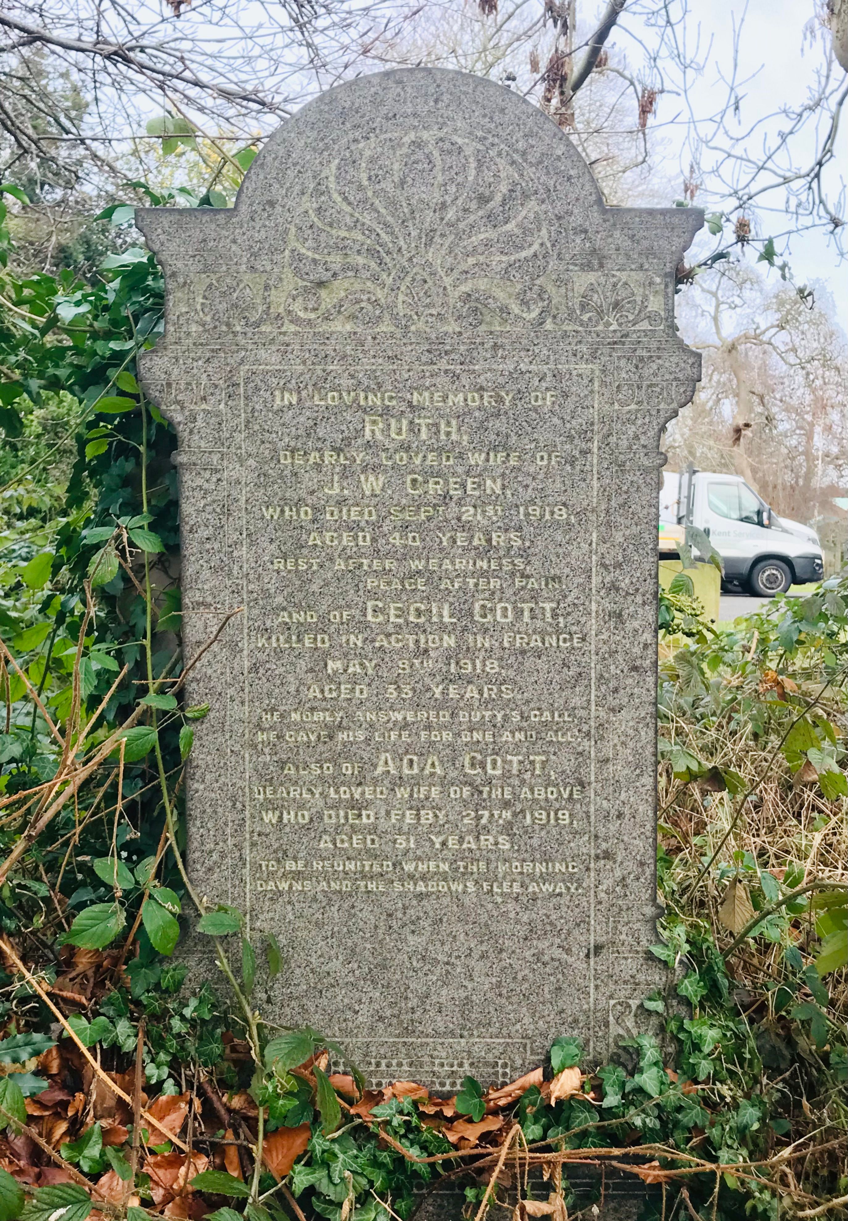 Inscription family gravestone, Nottingham General Cemetery: ‘In loving memory of Ruth, dearly loved wife of JW Green, who died Sept. 21st 1918, aged 40 years. Rest after weariness, peace after pain. And of Cecil Gott, killed in action in France, May 9th 1918, aged 33 years. He nobly answered duty’s call. Also of Ada Gott, dearly loved wife of the above, who died Feby, 27th 1919 aged 31 years. To be reunited when the morning dawns and the shadows flee away.’