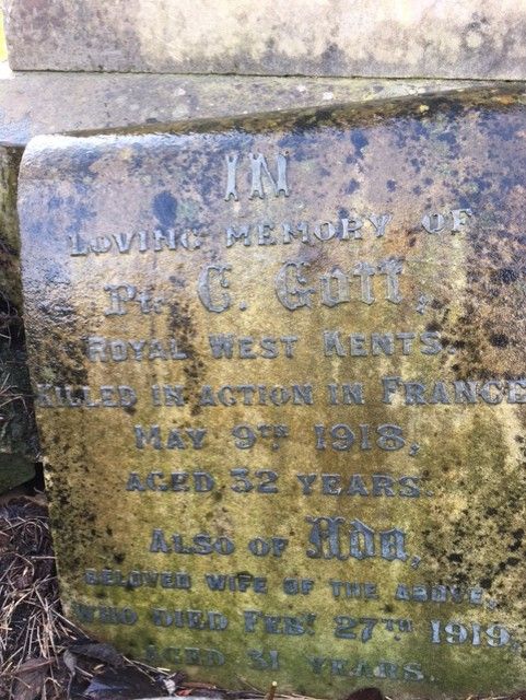 'Gott. Killed in action, May 9th, my only brother, Pte. Cecil Gott, Royal West Kents. 'Tis sweet to know we'll meet again, where partings are no more, and that the one we loved so well, has only gone before. – Brother Ernest, and wife and family.'