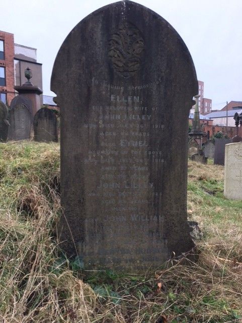 Nottingham General Cemetery, family grave/headstone. Inscription: ‘In loving memory of Ellen, the beloved wife of John Lilley, who died July 26th 1918 aged 62 years. Also Ethel, daughter of the above, who died July 30th 1918 aged 27 years. Also the above John Lilley who died December 27th 1925 aged 68 years. Reunited. Also John William their eldest son killed in action in France May 30th 1917 aged 23 years. Also Bertha Hudson, daughter of the above Ellen and John Lilley, died September 29th 1964 aged 76.’