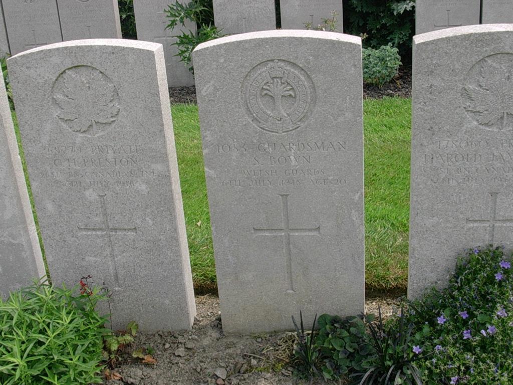 Private Sidney Bown enlisted at Nottingham, he served initially with service number 22145 in the Grenadier Guards, he was serving with the 1st battalio Welsh Guards he died of wounds on 6th July 1916 and is buried at Lijssenthoek Military Cemetery