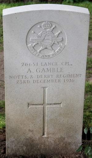 Nottingham Evening Post, ‘Roll of Honour’, 6 & 8 January 1917: ‘Gamble. Killed in action, December 23rd, 1916, Lance-Corporal A Gamble, age 24. Christ will link the broken chain, closer when we meet again. A noble life laid down. From brothers and sisters, Sam and Percy, Annie [Percy's wife], Edith [Samuel's wife] and Emily.’ (www.britishnewspaperarchive.co.uk)
