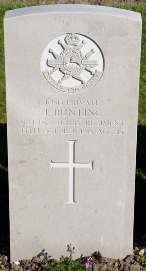 Private John Bunting enlisted at Nottingham and became a professional soldier. He served with 2nd battalion Sherwood Foresters Regiment he went to France on 8th September 1914 and died of wounds, 13th October 1915, aged 25, at No. 10 Casualty Clearing Station (Remy Siding), Belgium.