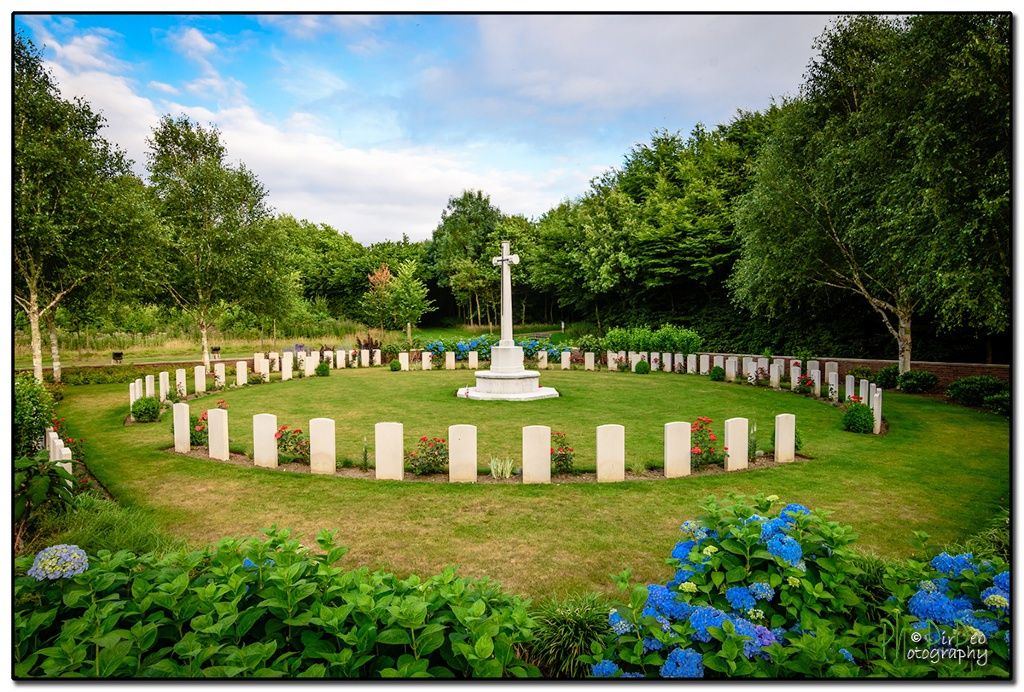 CWGC history of Hedge Row Trench Cemetery (extract): the Cemetery is 4km from the town or Ieper [Ypres]. 'Hedge Row Trench Cemetery was begun in March 1915 and used until August 1917, sometimes under the name of Ravine Wood Cemetery. The cemetery suffered very severely from shell fire, and after the Armistice the positions of the individual graves could not be found or reconstructed. The headstones are therefore arranged symmetrically round the Cross of Sacrifice.' (www.cwgc.org)