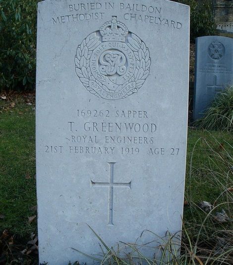 Tom died of pneumonia in Nottingham on 21 February 1919 (death registered 1919 J/F/M Nottingham). He was buried in the Wesleyan Methodist Chapelyard, Baildon, Yorkshire. His is the only CWGC burial.