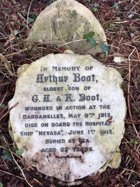 Nottingham General Cemetery, memorial stone at the foot of the family grave, inscription: 'In memory of Arthur Boot, eldest son of GH & K Boot, wounded in action at the Dardanelles, May 9th 1915, died on board the Hospital Ship "Nevasa", June 1st 1915. Buried at sea. Aged 22 years.'