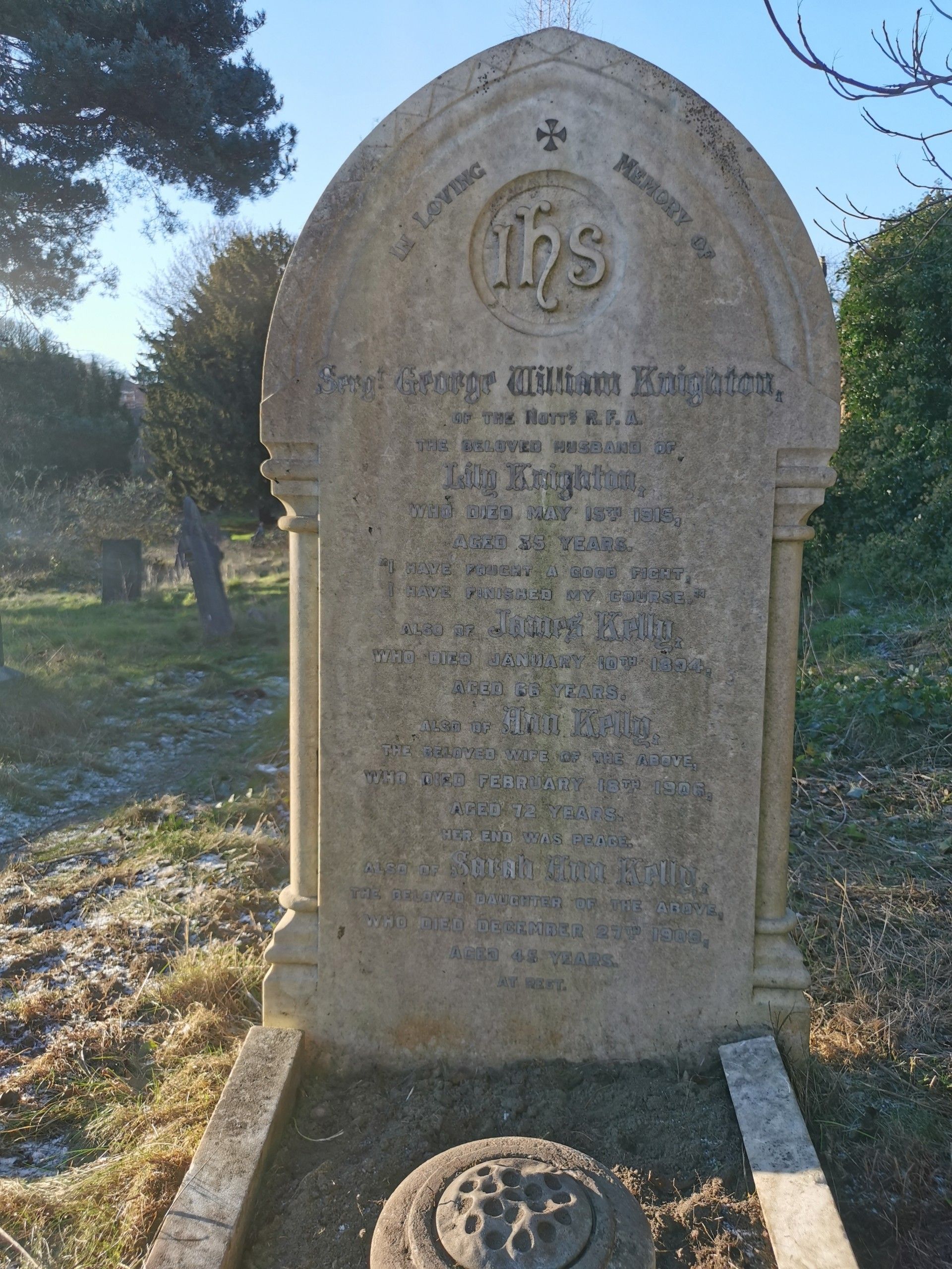 Nottingham Evening Post, 'Roll of Honour', 15 & 17 May 1915: ‘Knighton. Sergeant George William Knighton RFA, aged 35 years, husband of Lily, 55 Manvers Street. Interment at Waverley Street [Nottingham General Cemetery].’ (www.britishnewspaperarchive.co.uk)