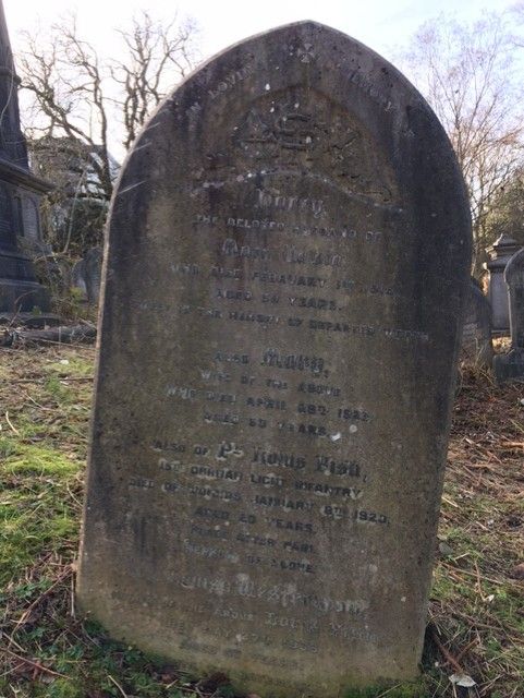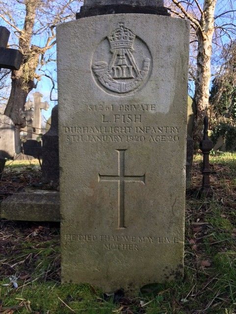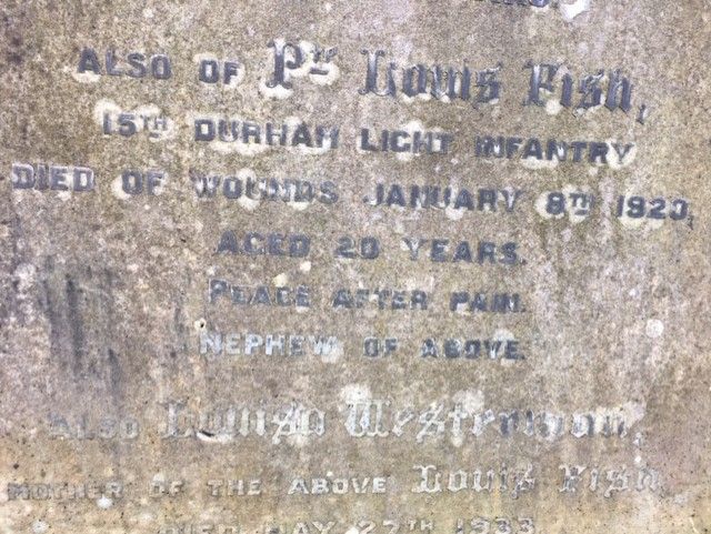 Nottingham General Cemetery. Family grave/headstone, inscription: 'Also of Louis Fish, 15th Durham Light Infantry, died of wounds January 8th 1920, aged 20 years. Peace after pain. Nephew of the above.' [Harry and Mary Unwin]