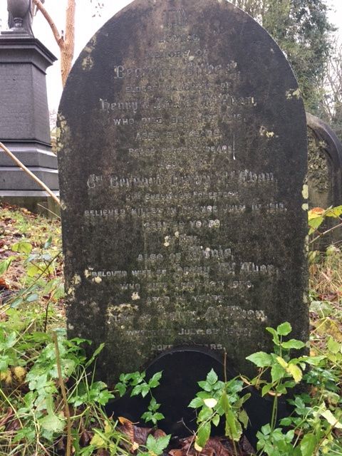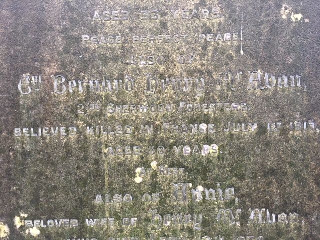 Nottingham General Cemetery, family grave and headstone: 'Beatrice Gilbert eldest daughter of Henry & Annie McAvan who died December 27th 1916 aged 33 years. Peace Perfect Peace. Also of Cpl Bernard Henry McAvan, 2nd Sherwood Foresters. Believed killed in France July 1st 1917, aged 30 years. At Rest. Also of Annie, beloved wife of Henry McAvan who died July 8th 1940 age (-) years.'