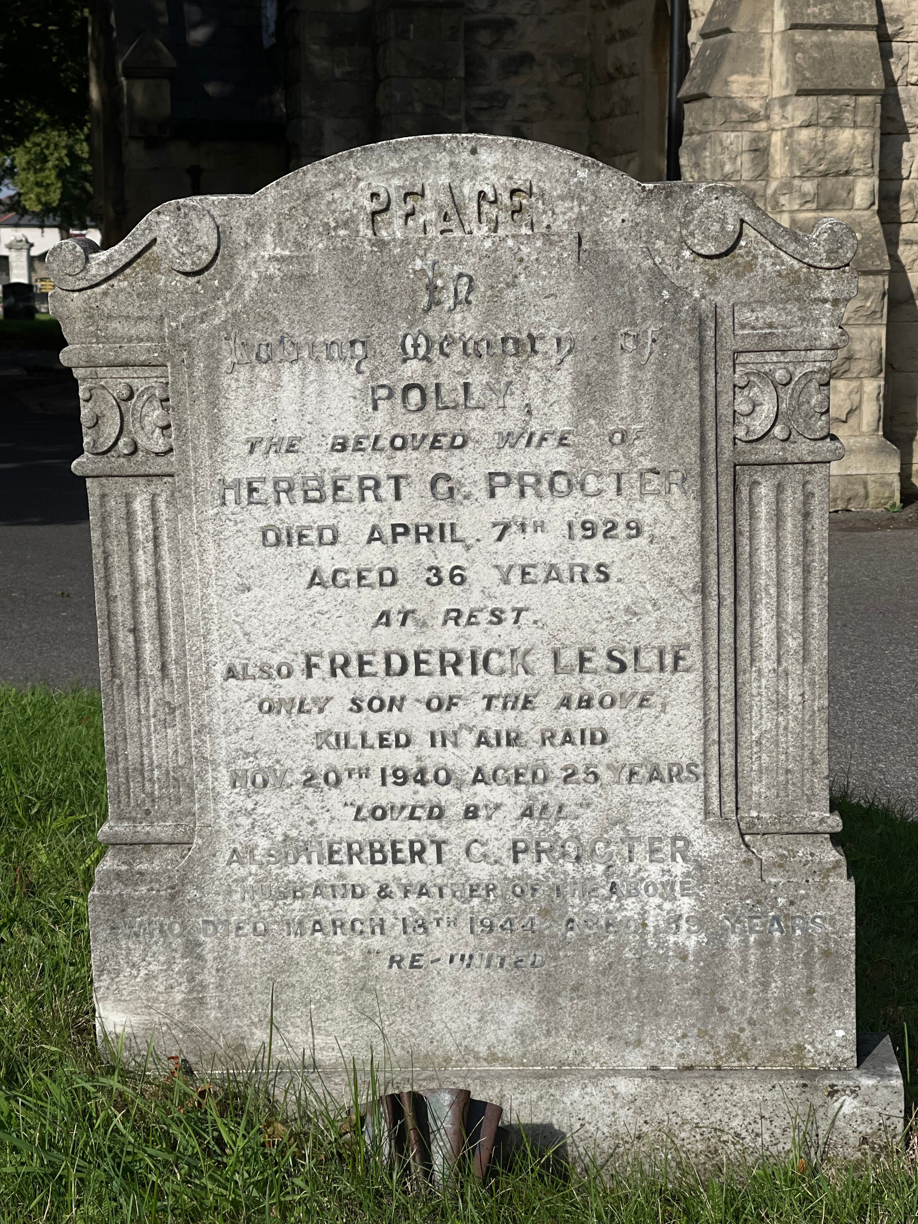 He was the son of Herbert Green Procter and Polly Procter and the brother of Dorothy Procter of 114 Kitson Road, Worksop. He was engaged to Amy Webster of Matlock. Procter died at Hughes' Biscuit Factory, Bordesley Green, Birmingham (See Extra Information).