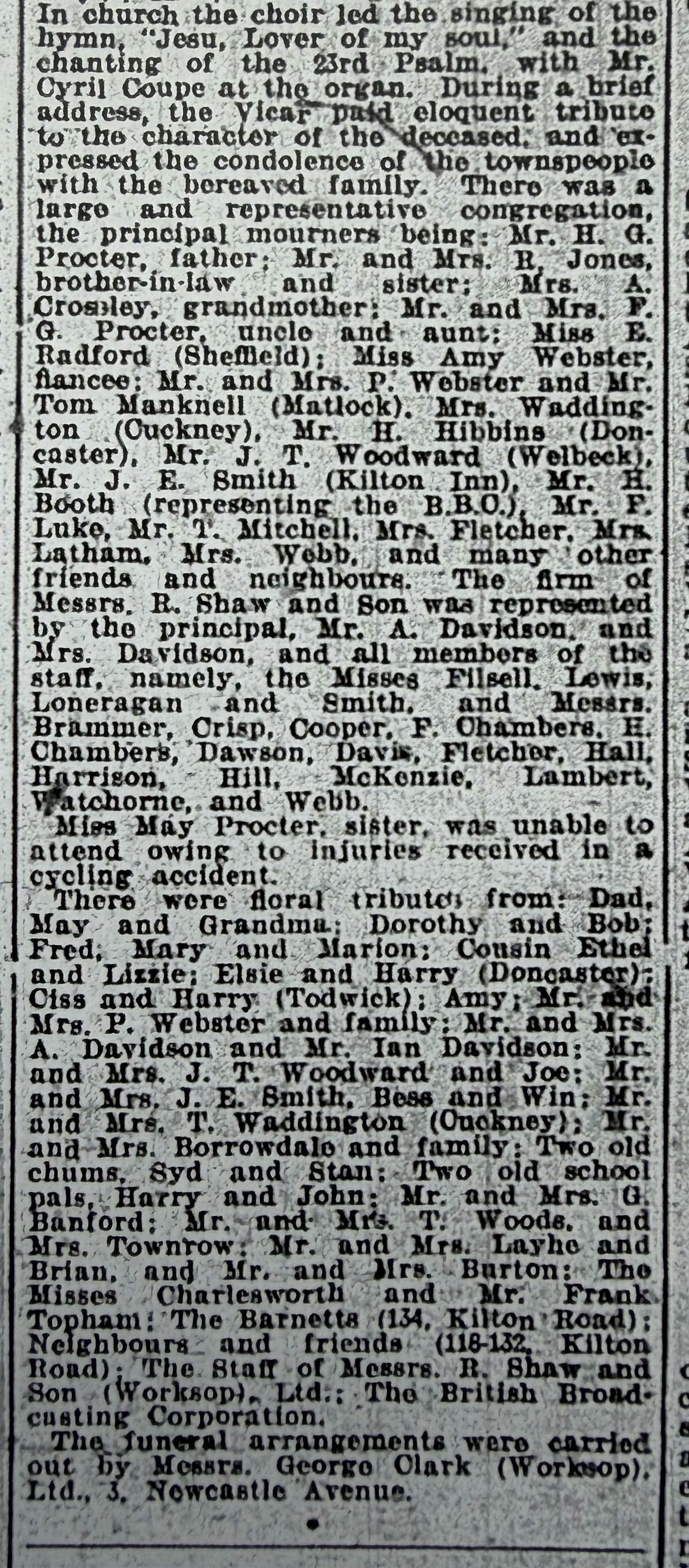 Frederick Leslie Procter attended Worksop's Central School and was then employed by R Shaw & Sons in the town as a radio engineer. He was remembered as a conscientious craftsman well qualified after attending courses at the County College in Worksop. He had progressed to a maintenance engineer's post with the BBC by the time of his death. (Worksop Guardian 29/11/1940 via Michael Szarelis).