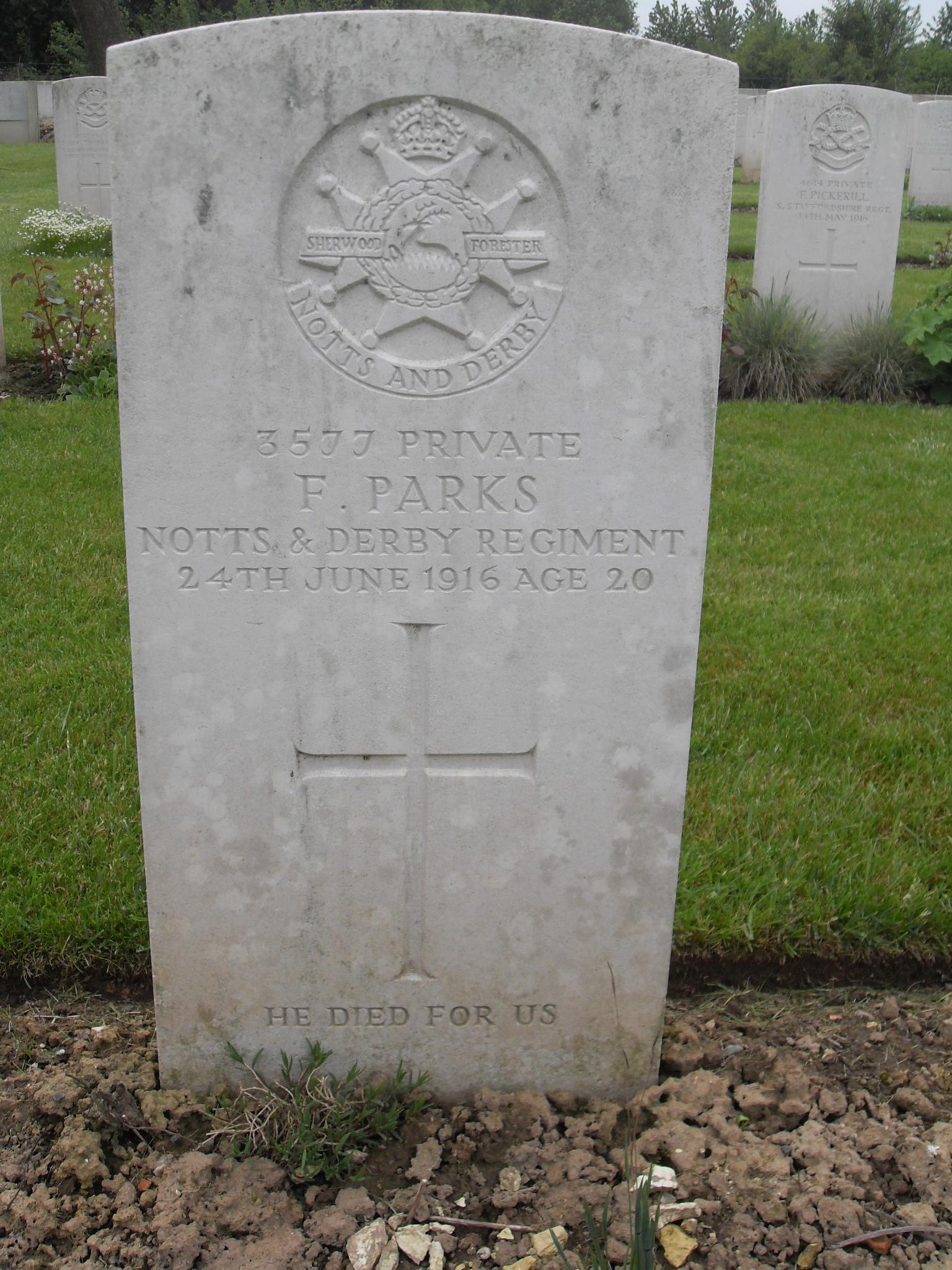 Private Frank Parks enlisted at Nottingham 11th November 1914 he served with the 7th battalion Sherwood Foresters Regiment. He went to France 18th August 1915. and died of wounds on 24th June 1916, aged 20.