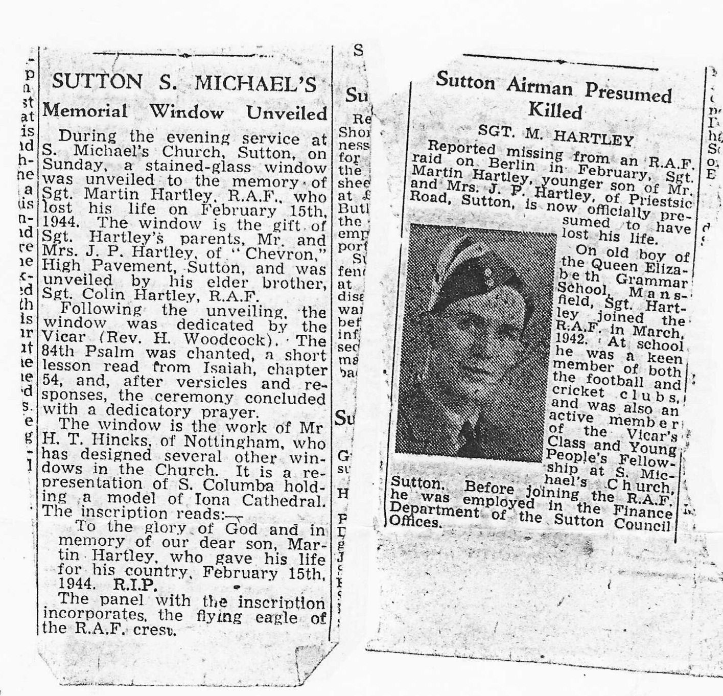 Probate: Hartley Martin of The Dairy Priestic Road Sutton in Ashfield Nottinghamshire died 16 February 1944 on war service. Probate Nottingham 31 May to Joseph Percy Hartley dairyman. Effects £285 6s. 8d.