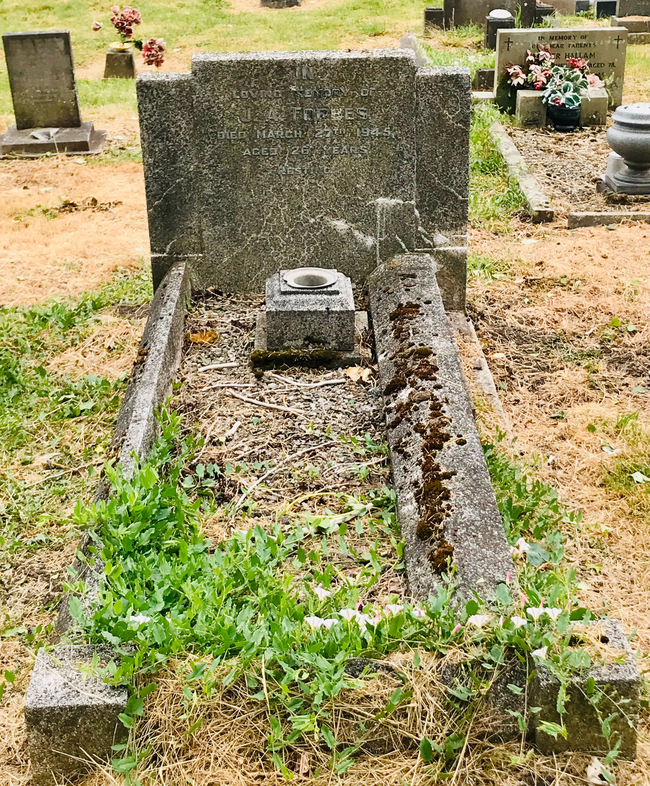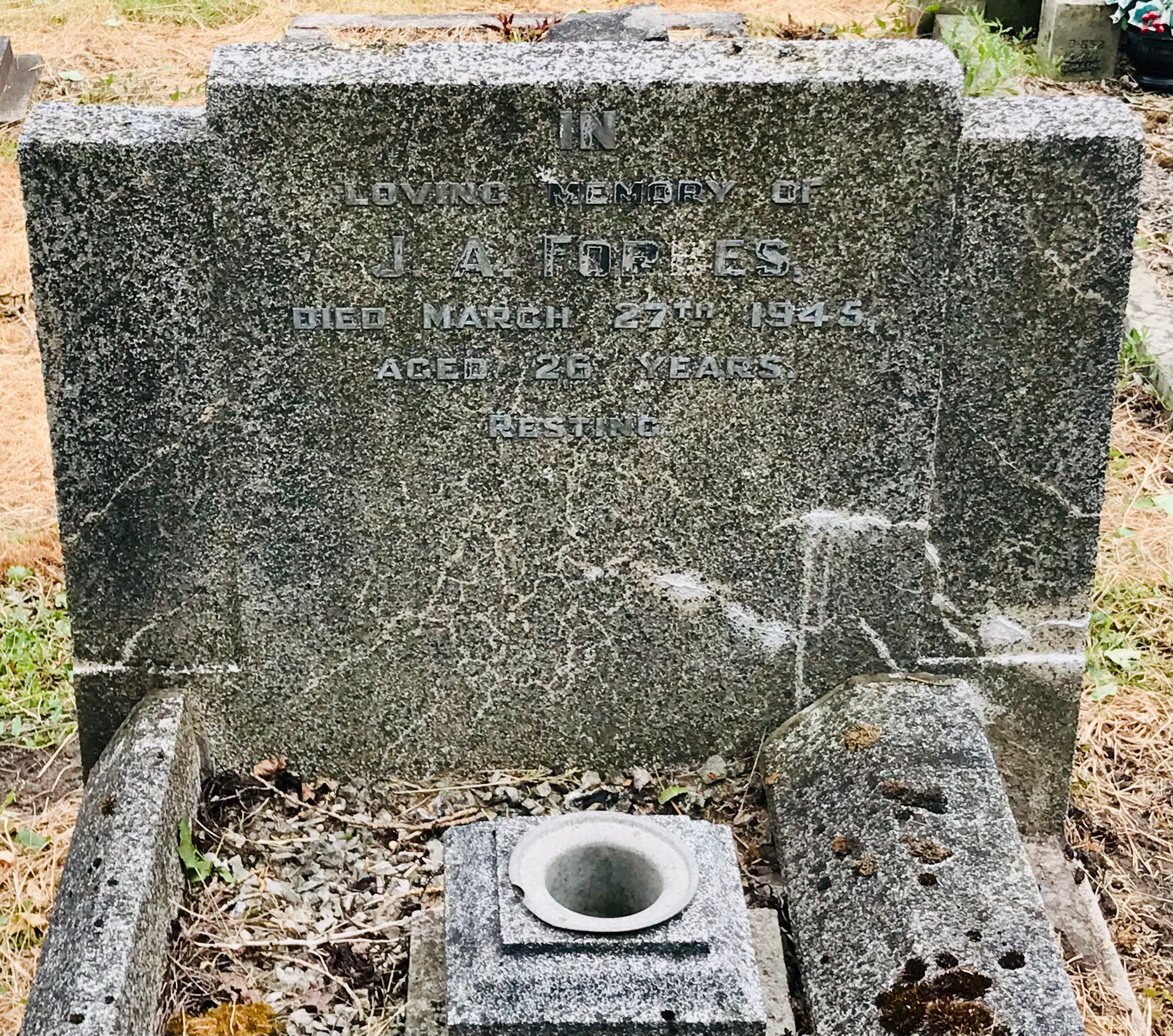 A headstone on the grave of a J. A. Forbes in Hucknall Cemetery gives a date of death as 27th March 1945, aged, 26 years but there is no other useful information to help corroborate, but it appears to fit.