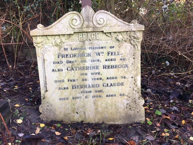 Nottingham General Cemetery: headstone inscription: 'In loving memory of Frederick Wm. Fell, died Decr. 30. 194, aged 48. Also Catherine Rebecca his wife, died Feby 22. 1940, aged 76. Also Bernard Claude their son, died Sept. 8th, 1939, aged 45'