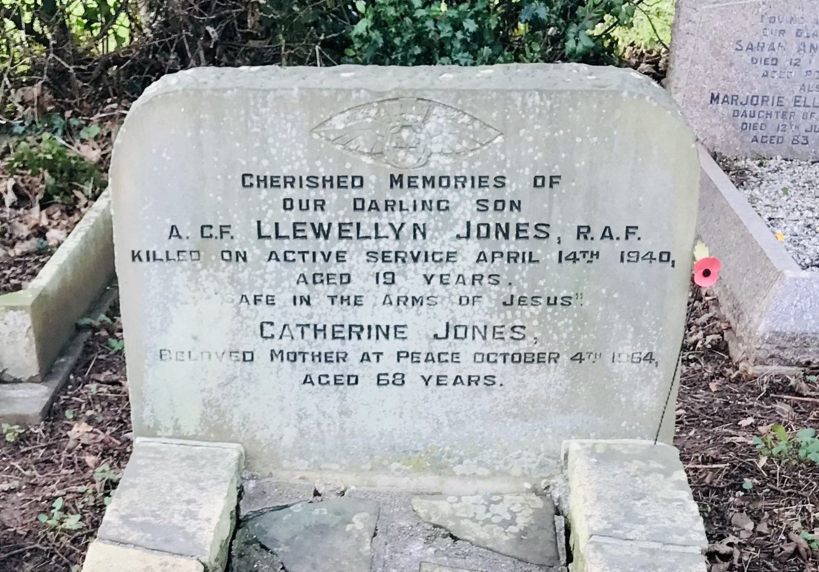 The Inscription on the Family grave reads : "Cherished Memories of our darling Son, A. C.F. Llewellyn Jones R.A.F.