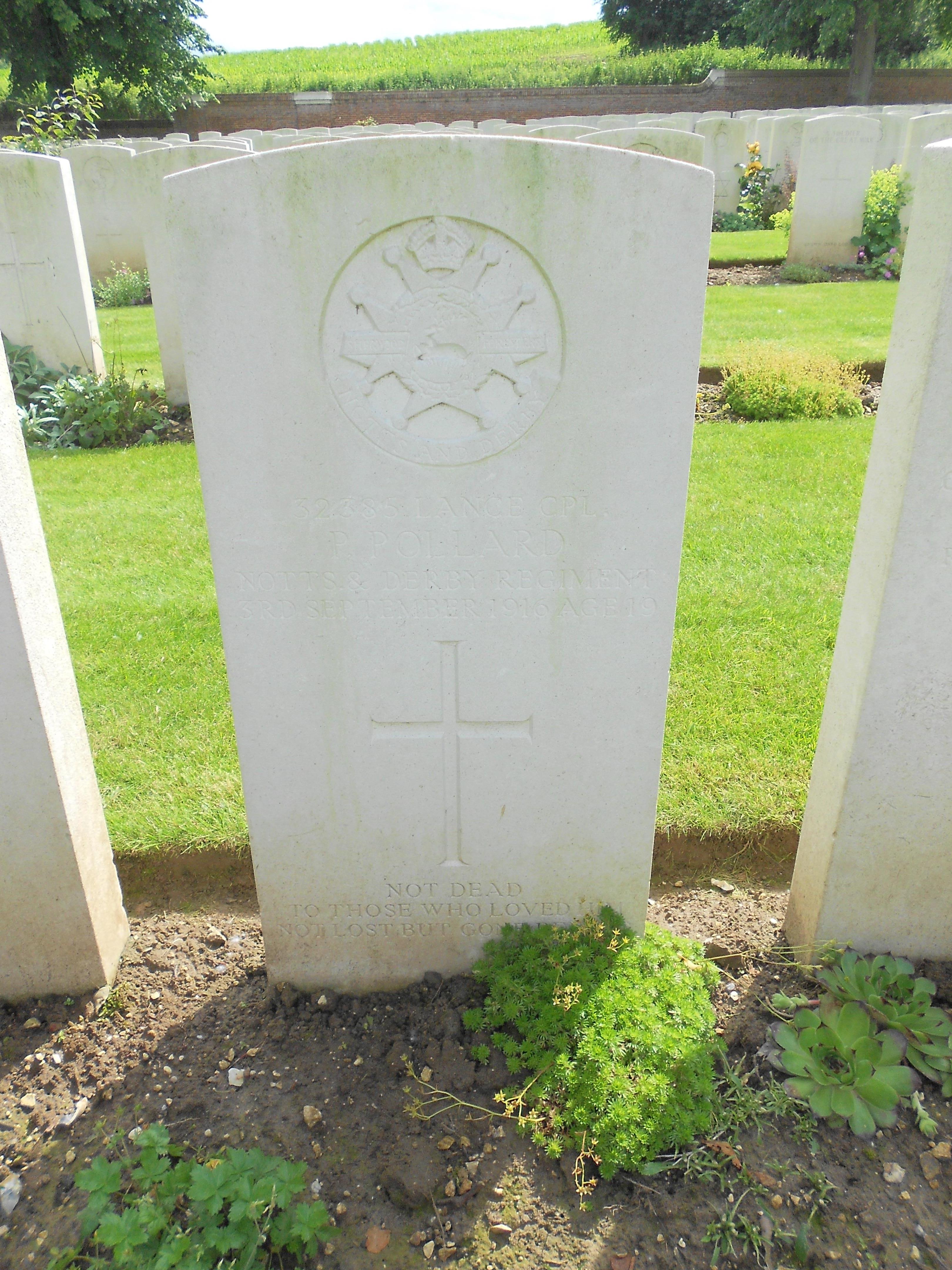 Private Percy Pollard enlisted at Nottingham whilst residing at Stapleford, he was killed in action on 3rd September 1916 and is buried at Ancre British Cemetery, Beaumont-Hamel, France. Plot 6. Row F. Grave 9.