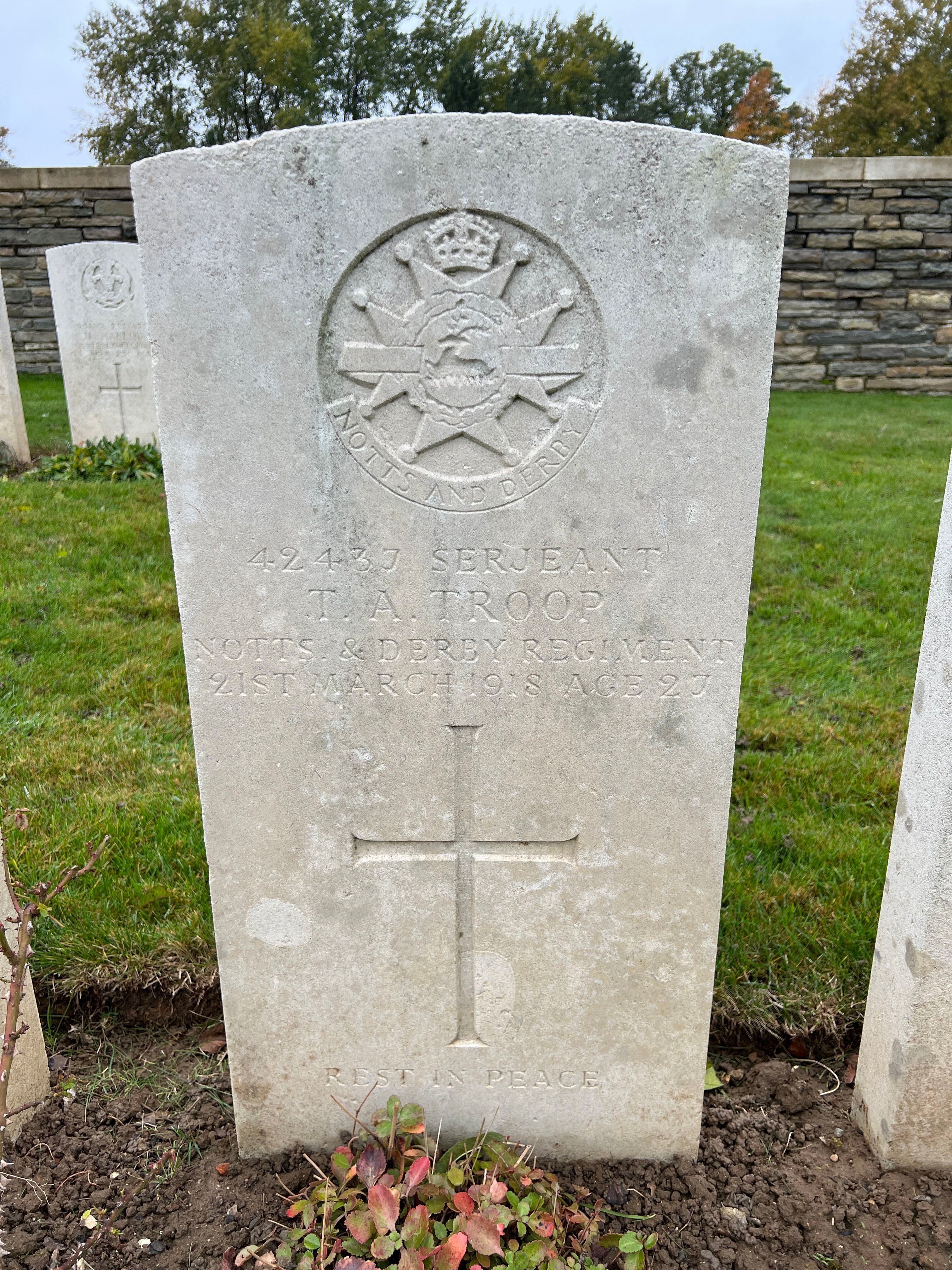 Private Thomas Allen Troop was attested 11 Dec 1915 at Doncaster, he was 24 yrs of age and was a wood carter, his next of kin was his father Thomas. his was posted to the reserve, he was mobilised for war on 12th April 1916 approved by the magistrate on 13 April 1916, embarked to France 9 July 1916 and joined 10th Sherwood Foresters on 22July 1916. His promotion to L/Cpl came on the 3rd of March 1917 and four months later on the 11th July he was wounded with gun shot wounds to his right arm and admitted to hospital. After being discharged a month later, he gained his rank increase to Corporal on the 31st August and Sergeant on 25th September1917. It was six months later that he was reported missing on the 21-23 March 1918 and was recorded as being killed on the 21st. whilst holding the line near Sorrell Wood/Longeuval, France on the opening day of the German Spring Offensive or (Kaiserschlact)