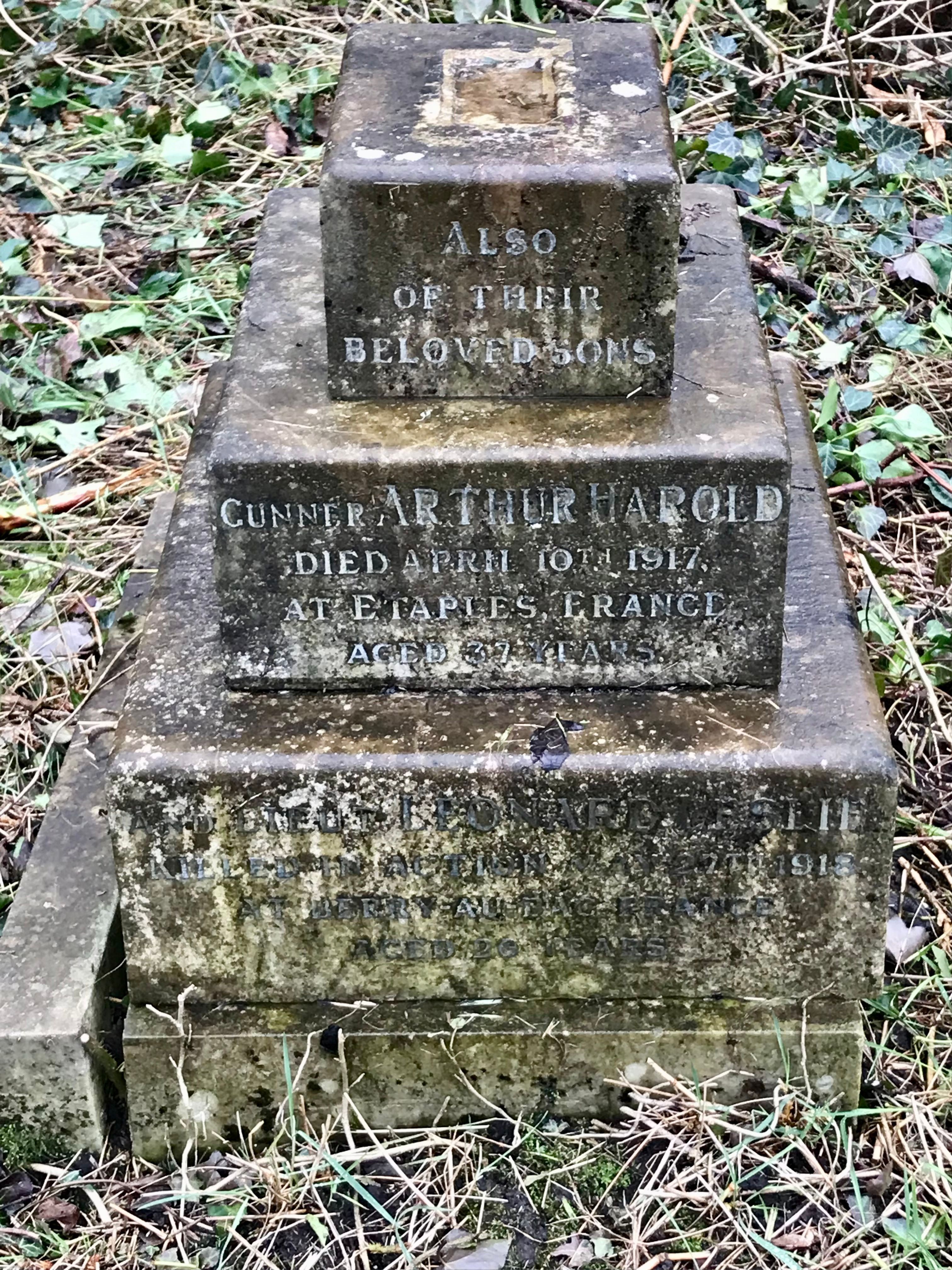 Nottingham General Cemetery: family grave and headstone with inscription: (Face 1) In loving memory of Arthur Alfred Dawson. Died March 6th 1905 aged 49 years, Also of his wife Harriet Eleanor died March 23rd 1926. Also of Mary Ann Walker, devoted & faithful friend of the late Mr & Mrs AA Dawson & family. Died July 20th 1937 aged 73 years. (Face 2) Also of their beloved sons Gunner Arthur Harold died April 2nd 1917 at Etaples, France, age 37 years. And of Lieut. Leonard Leslie killed in action May 27th 1918 at Berry-Au-Bac France aged 26 years. (Face 3) Also of Florence, the beloved wife of Percy Alfred Dawson who died March 6th 1943, aged 64 years. (Face 4) Also of their beloved daughter, Violet Evelyn, died July 22nd 1899, aged 15 years. Note: Mary Ann Walker was the family's nursemaid at the time of the 1891 and 1901 Census.