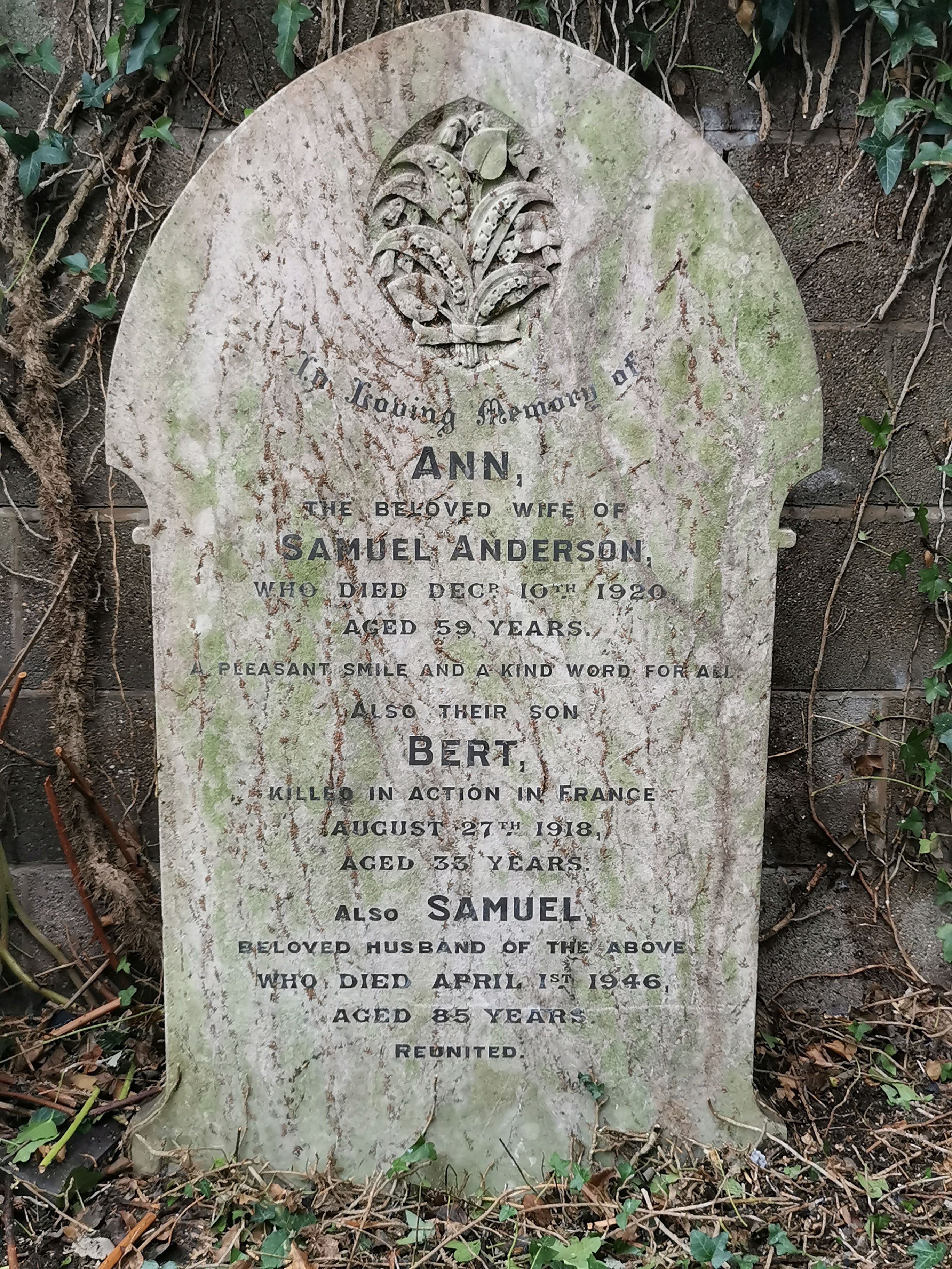 Inscription: ‘In loving memory of Ann, the beloved wife of Samuel Anderson died Decr. 10th, 1920 aged 59 years. A pleasant smile and a kind word for all. Also their son Bert, killed in action in France, August 27th, 1918 aged 33 years. Also Samuel, beloved husband of the above, died April 1st, 1946 aged 85 years. Reunited.'